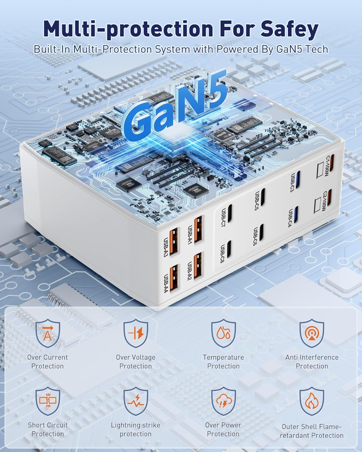 - γ12-in-1 USB C Charging StationγThis 600W USB C Charger Block comes with 8 USB C ports and 4 USB A ports to charge multiple devices, simplify your charging setup, and let you experience the convenience of ultra-fast and ultra-high output charging. With its smart charging technology, it can automatically detect and provide the best power output for each connected device, ensuring fast and efficient charging.