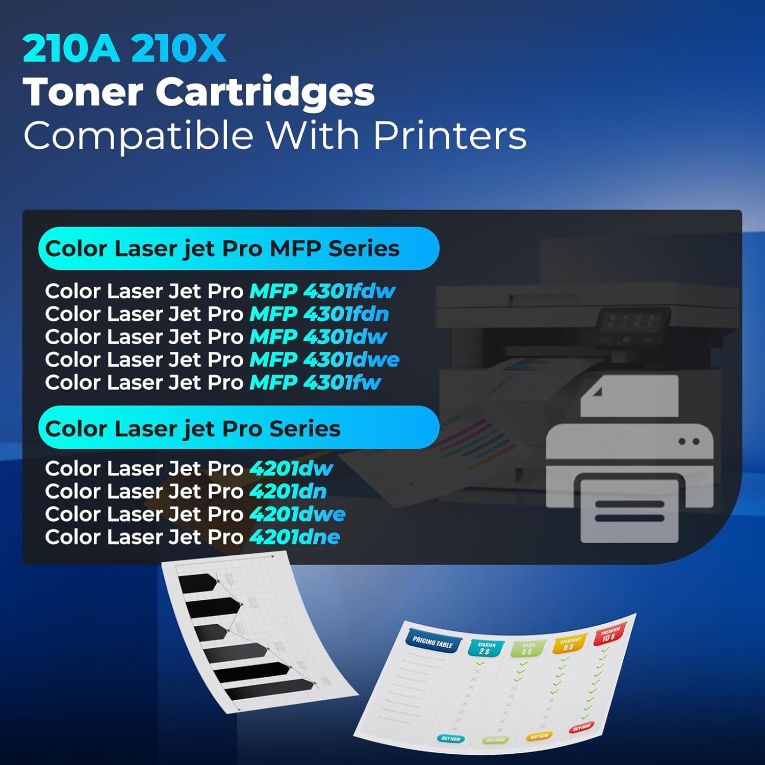 - 210X Toner cartridges Feature: High Yield Toner 210X compatible for hp 210X 210A toner cartridges Black Color Combo Pack compatible for Color Laser Jet Pro MFP 4301fdw Toner, MFP 4301fdn Toner, MFP 4301dw Toner, MFP 4301dwe Toner, MFP 4301fw Toner cartridges, compatible for Color Laser Jet Pro 4201dw Toner, 4201dn Toner, 4201dwe Toner, 4201dne Toner cartridges