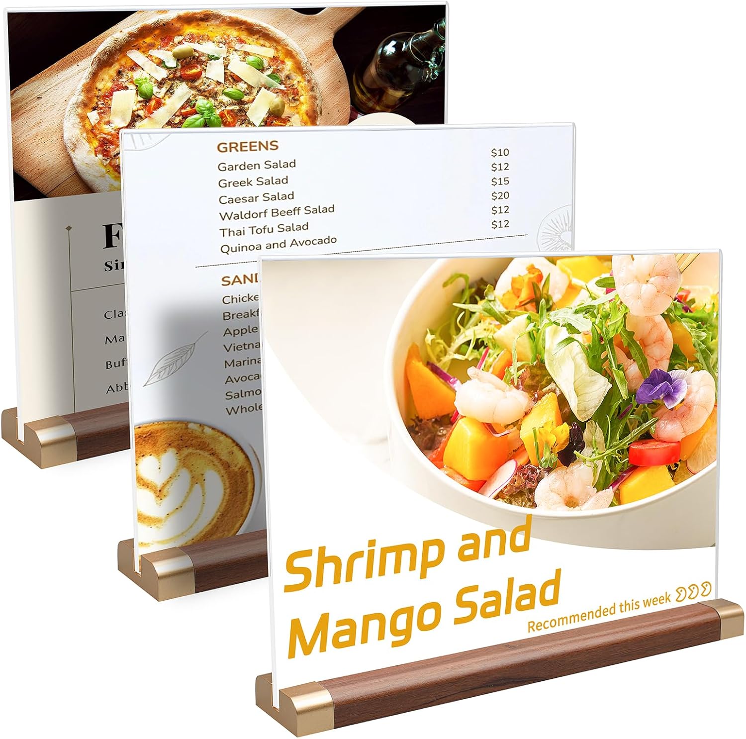 Acrylic Sign Holder 8.5 x 11 with Wood Color Base, 3 Pack Clear Tabletop Double-Sided T Shape Display Sign Frame Horizontal for Store/Coffee Shop/Office/Hotel Business Display Holder