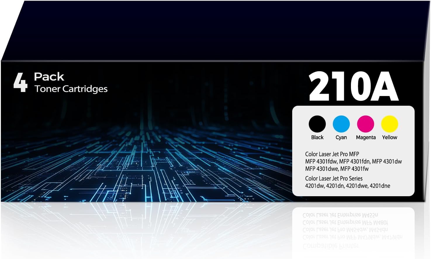 - 210A Toner High Compatibility: 210A toner cartridges Combo Pack Compatible for hp Color Laser Jet Pro MFP 4301fdw toner cartridges, Color Laser Jet Pro MFP 4301fdn toner cartridges, Color Laser Jet Pro MFP 4301dw toner cartridges, Color Laser Jet Pro MFP 4301dwe toner cartridges, Color Laser Jet Pro MFP 4301fw toner cartridges; 210A toner Compatible for Color Laser Jet Pro 4201dw toner cartridges, Color Laser Jet Pro 4201dn toner cartridges, Color Laser Jet Pro 4201dwe toner cartridges, Color Laser Jet Pro 4201dne toner cartridges