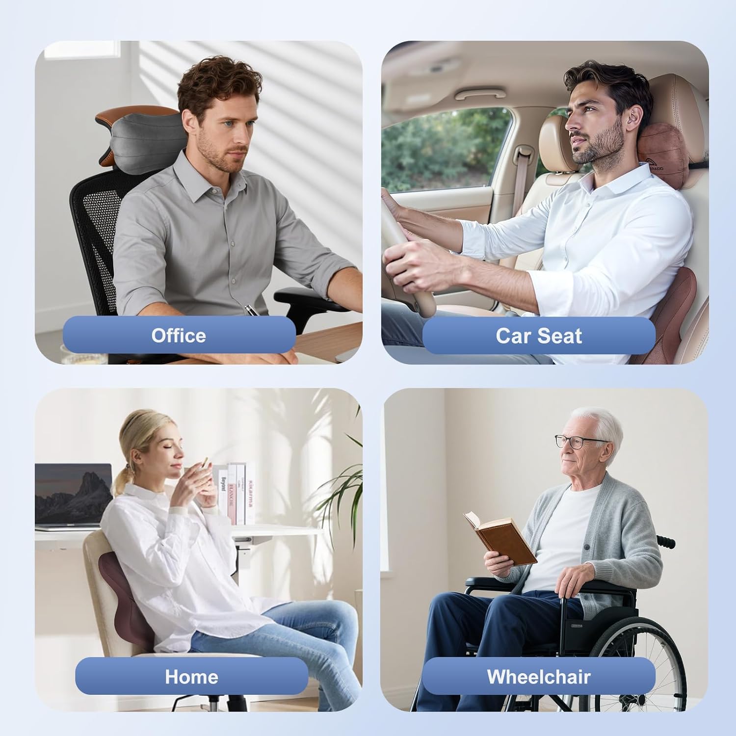 - Universal CompatibilityοΌThis neck pillow and lumbar support set is highly versatile, not only for car seats, but also for office chairs, wheelchairs and other seat scene, the neck pillow features an adjustable strap that can be tightened or loosened to fit securely on different seat headrests