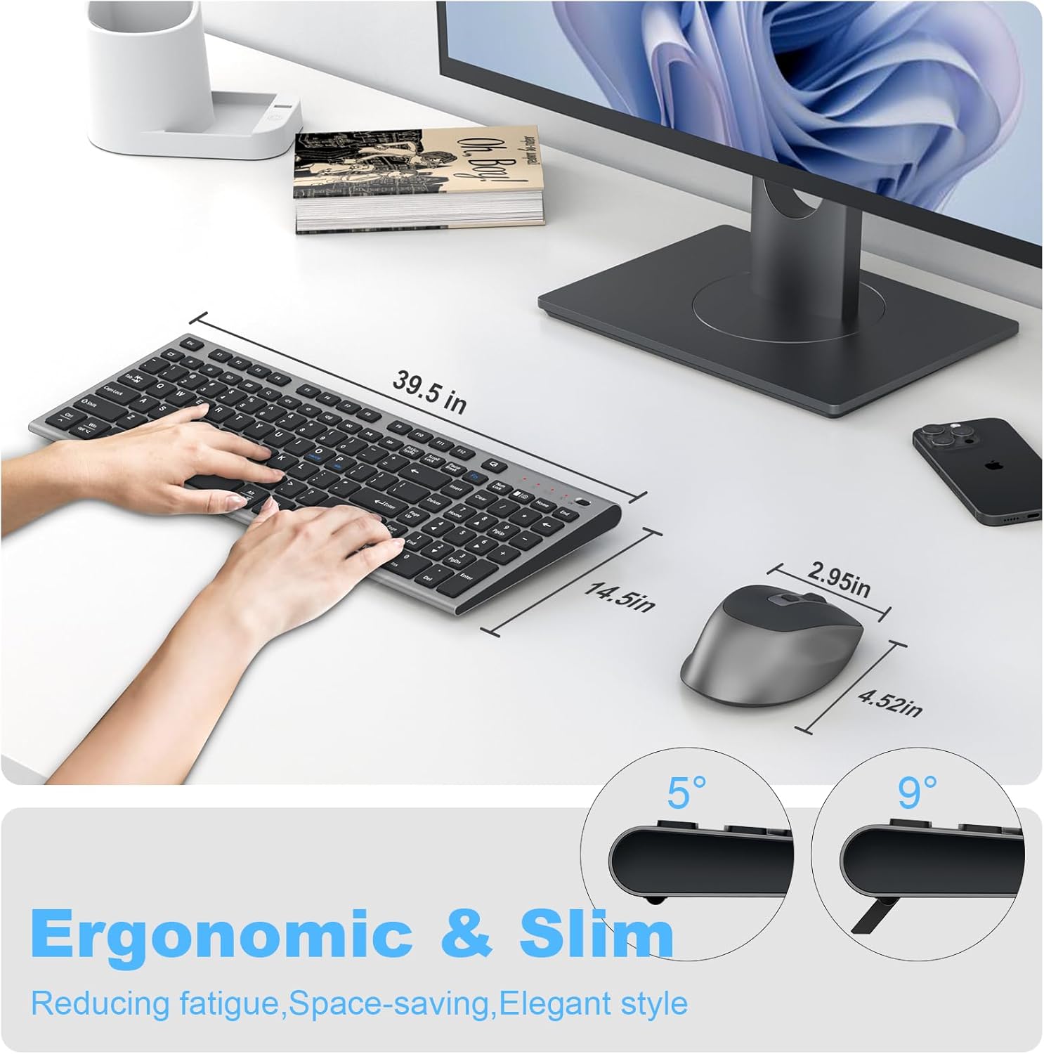 - γErgonomics Designγ: The key board tilt is adjustable, Effectively reduces hand fatigue.50-60g X-shaped structure keys, Achieve ultra-short stroke fast click and smooth typing experience. The concave surface of the keys makes it more comfortable for your fingers. The surface power switch and numeric keypad make operation efficient and convenient.Independent multimedia shortcut keys, Fully release the F1-F12 keys. 121-key compact layout, with full-size keyboard functions, while saving 10% of space, Achieve shorter and more convenient use distance, freeing up more desktop space.The mouse is of moderate size.Its unique contour and curve design make it more comfortable for you to use.