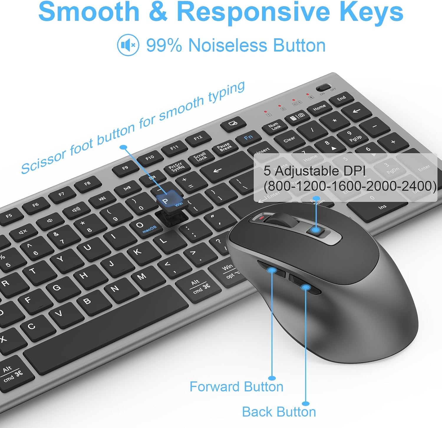 - γLow Profile and Muteγ: The keyboard adopts the X-frame design of the laptop keyboards. Bring an excellent low noise experience. The soft silicone shell not only protects the keyboard from water and dust, but also minimizes noise. The left and right buttons of the mice adopt excellent low decibel light click buttons. This design greatly reduces the noise of mouse use. Suitable for office, home, coffee shop, meeting room, school, and other occasions.