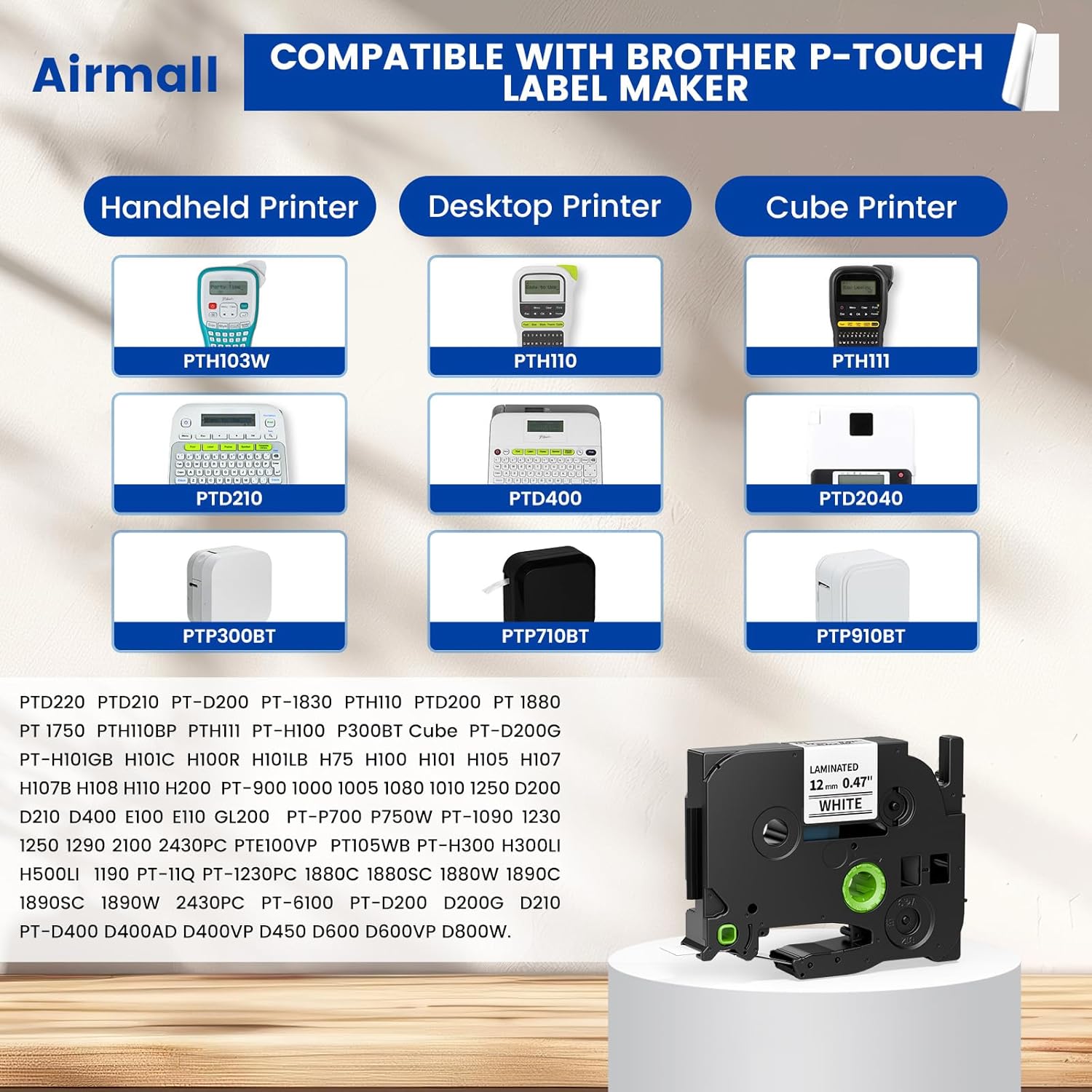 Airmall Tze 12mm 0.47 Laminated White Label Maker Tape Refill Compatible with Brother Ptouch Tape 12mm 0.47 White TZe-231 TZe231 for PT-D220 1180 1280 1290 1750 1830, 8 Pack