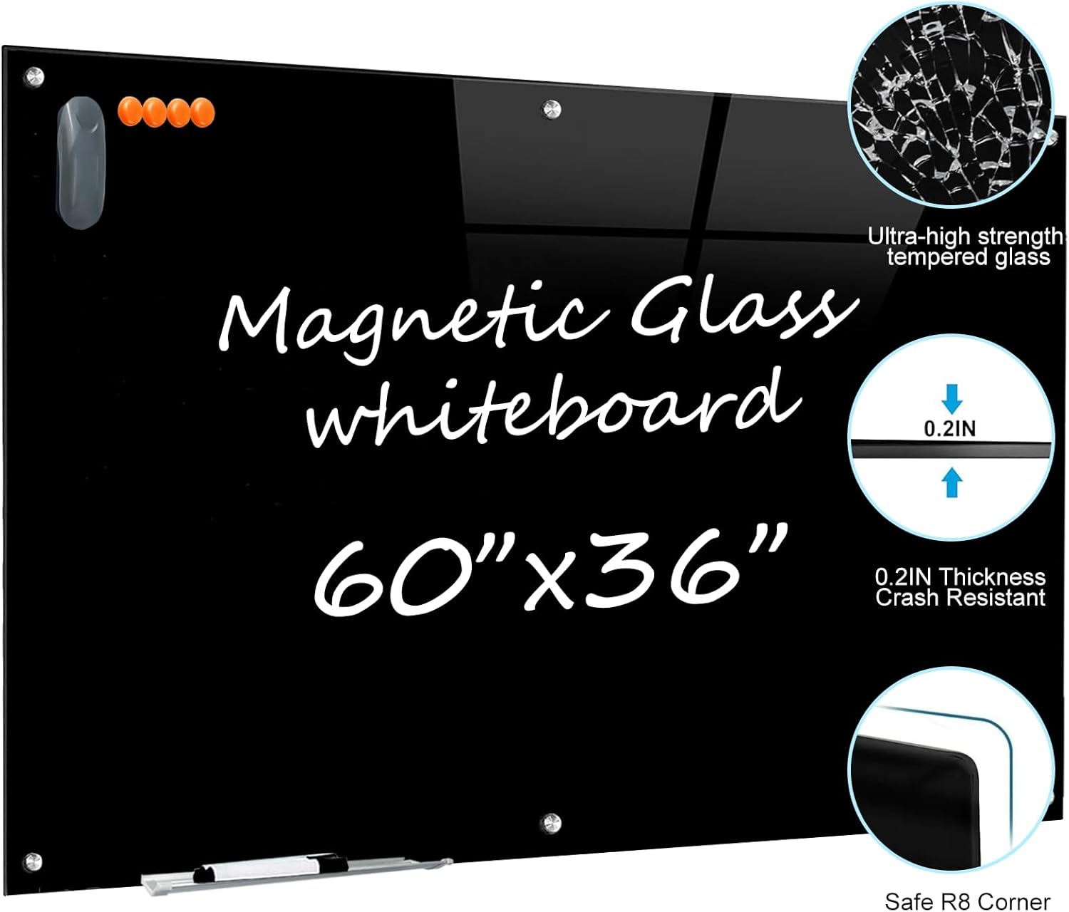 Glass Dry Erase Black Board - Magnetic Blackboard 60"X36" Frameless White Board Clear Glass Boards with Super Strong Magnets, Wall Mounted for Office, Classroom and Home