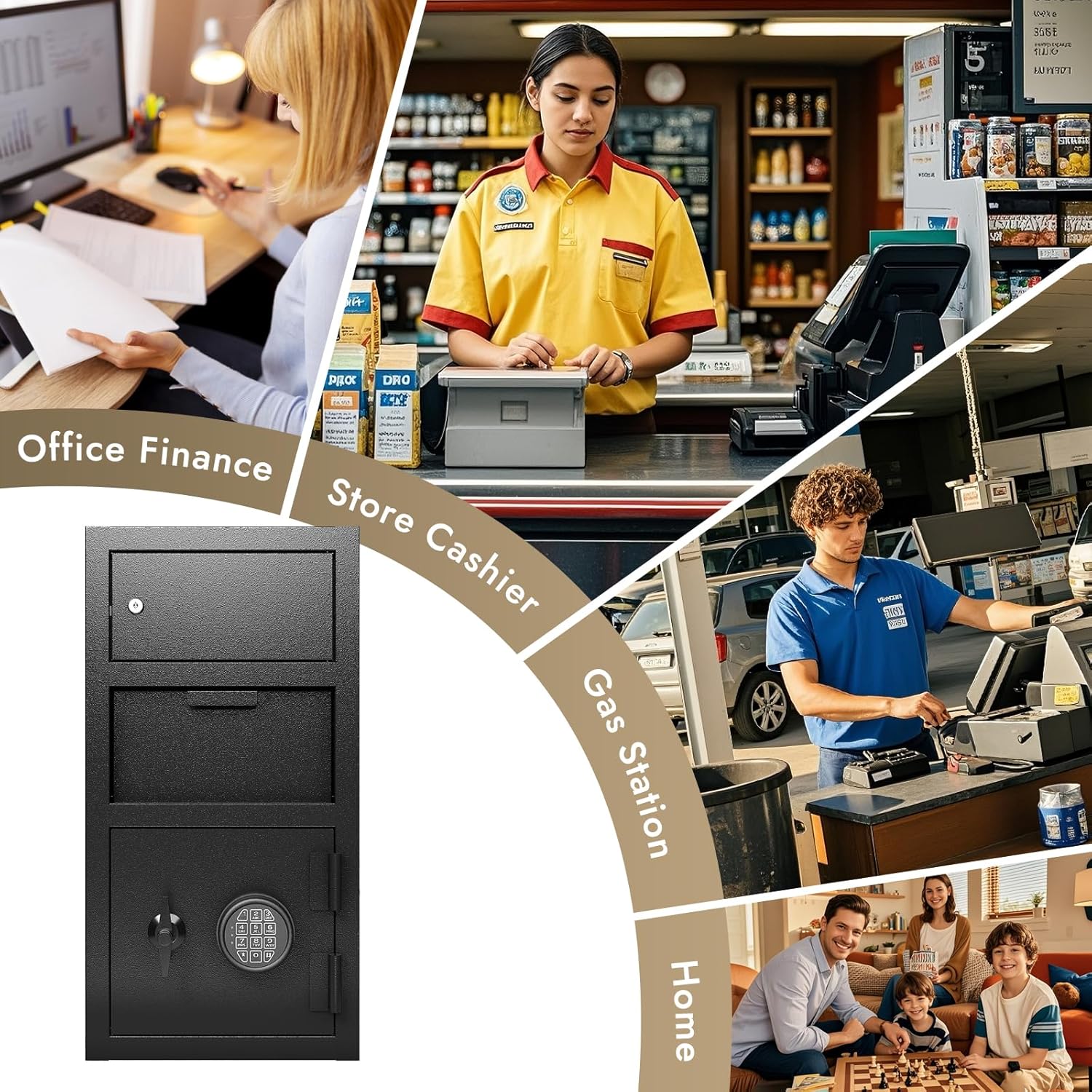 - Large Capacity Drop Safe for Business : This Kaer safe box with drop slot on top allows staff to quickly deposit without opening the doorβenhancing both convenience and security. Money safe for cash, receipts, documents, jewelry, and other valuables. Safes for use in restaurants, retail stores, hotels, and offices where frequent cash deposits are required.