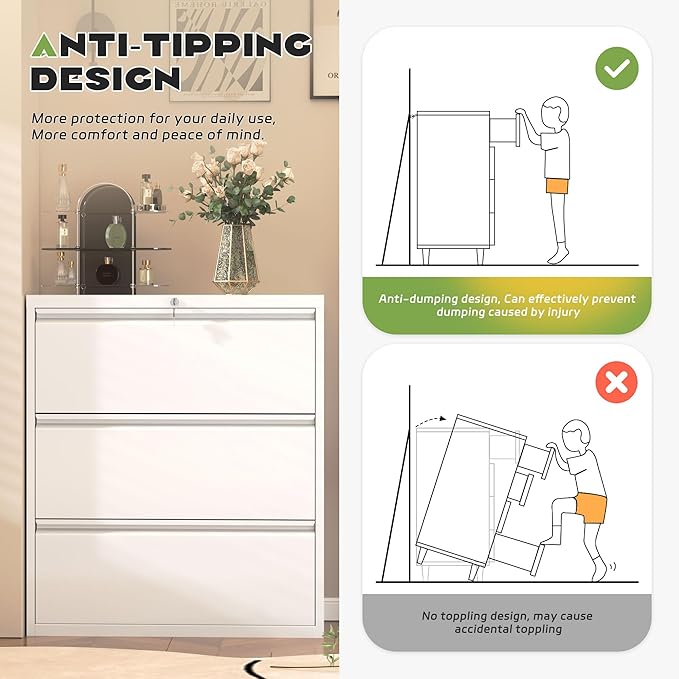 - ❤ Lockable File Cabinet -- Superday three drawer file cabinet uses an interlocking system, it locks all two drawers simultaneously and comes with two keys to protect your privacy and file security.Tips: 2 keys should be kept separately in case of losing. If you accidentally lose one key, another key can be used in case of emergency.