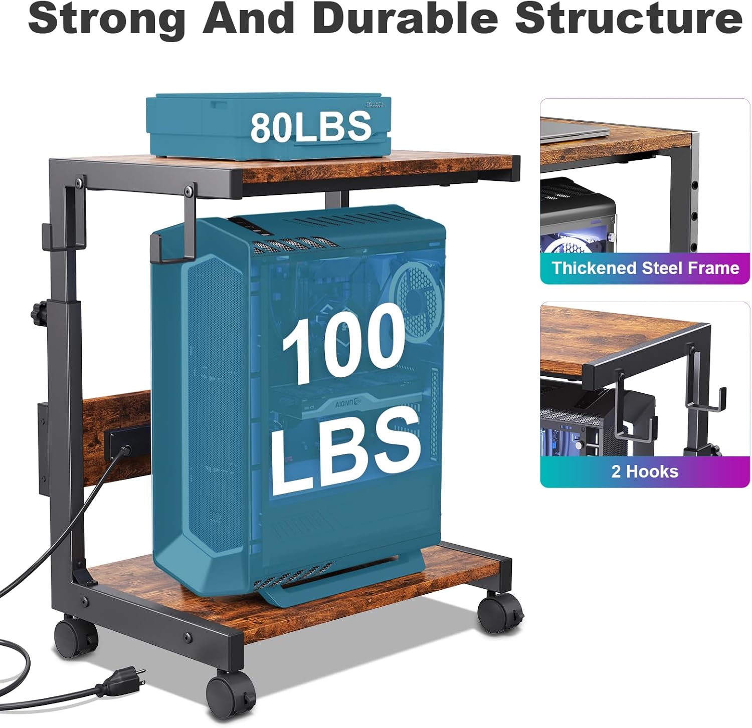 - Strong Construction: The top of this computer tower stand is made of thickened wood, which is scratch-resistant and moisture-proof. The main frame is made of thickened steel, which improves overall load-bearing capacity and stability, with a load-bearing capacity of up to 80 pounds. This product is highly stable, does not shake, and is not easily damaged or deformed