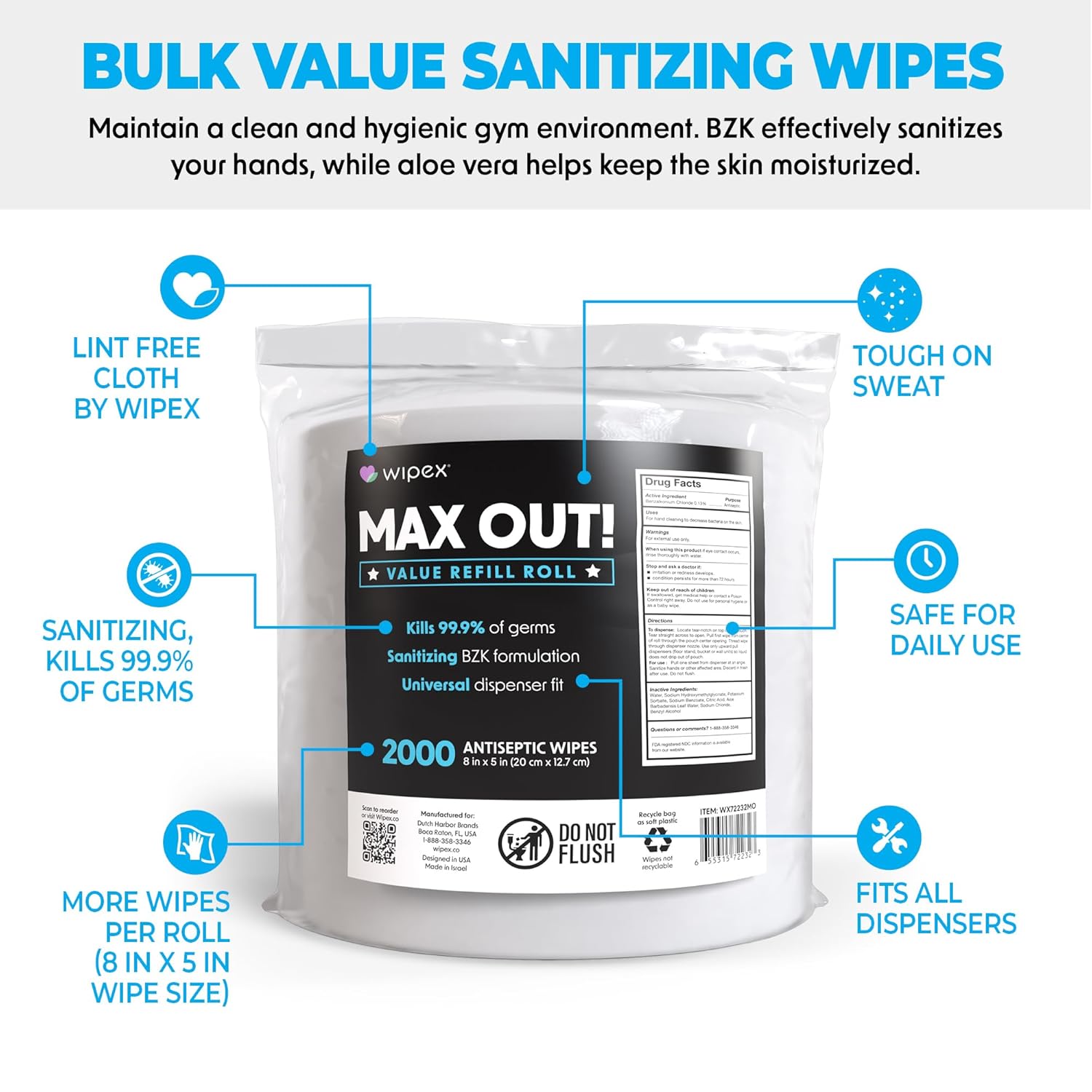 - Max Out Economical Fitness Wipes: Experience cost-effective hygiene with our pack of 4 Wipex Refill Rolls made with BZK. Each roll contains 2000 sanitizing wipes, ensuring a long-lasting supply of essential gym supplies for your facility's cleanliness.