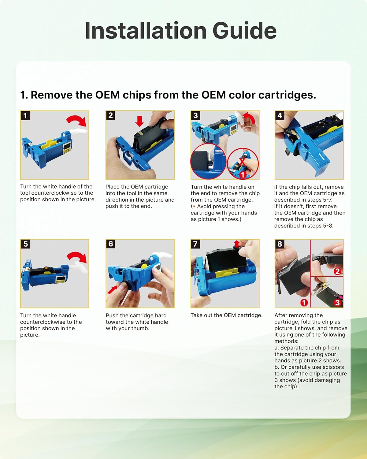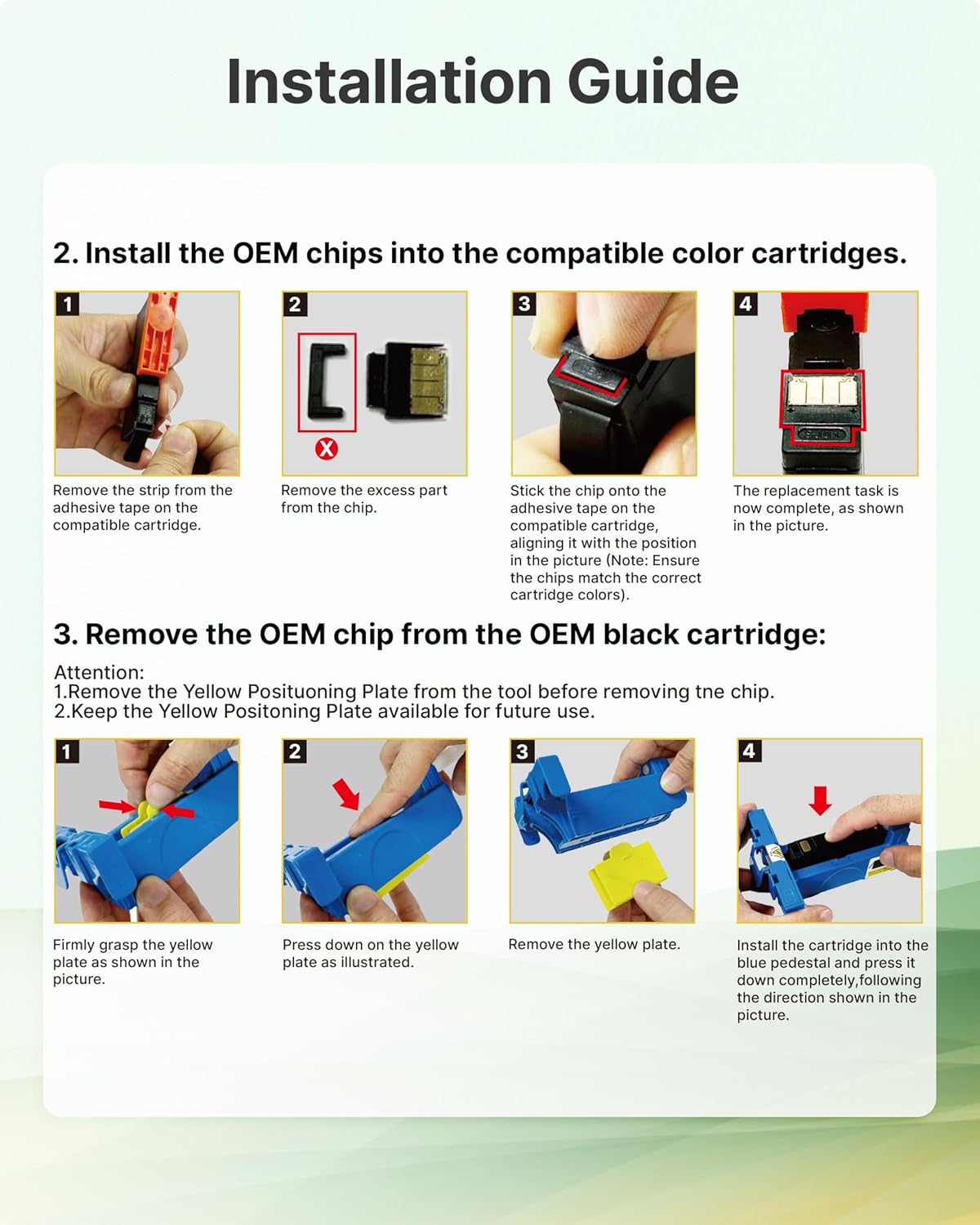 - 𝐍𝐨𝐭𝐢𝐜𝐞!𝐍𝐨 𝐂𝐡𝐢𝐩: Please check if you have the OEM 923 ink cartridges for hp printers before order and follow the Installation Guide to swtich the oem chip on Our 923 for HP ink cartridge to help it work well on your printer.