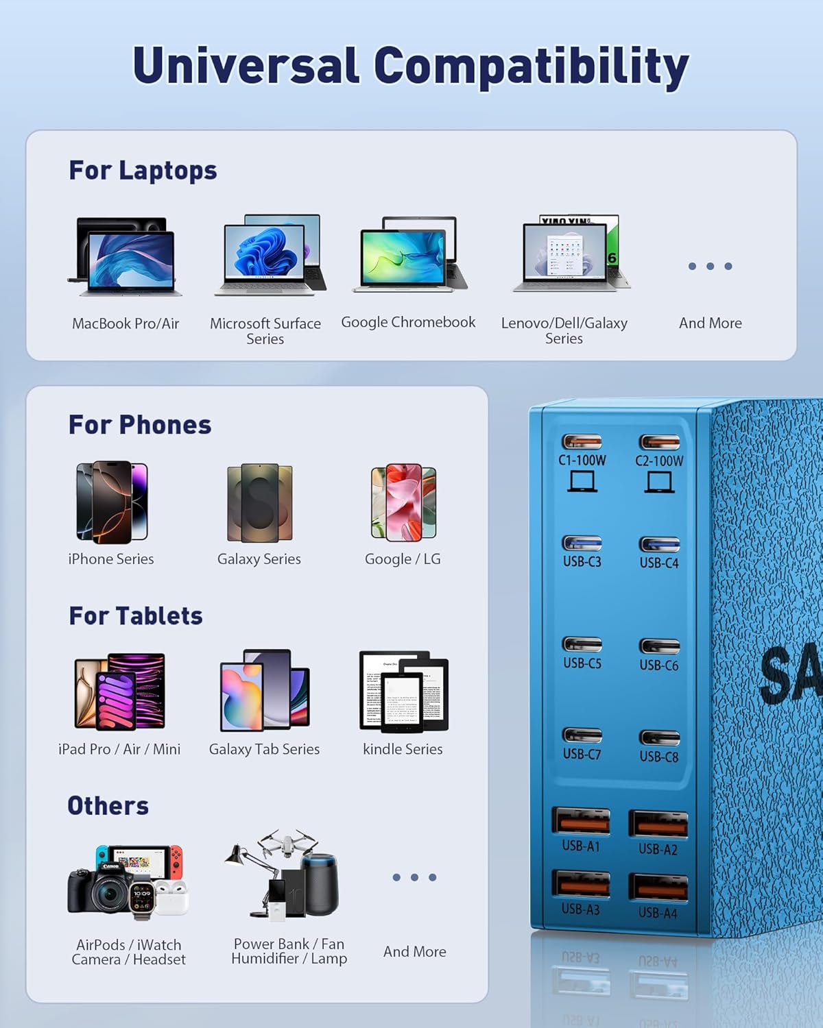 - γUniversal CompatibilityγOur USB C charging station is equipped with 2*100W and 2*65W fast charging ports, which can charge 3 or more laptops at the same time. Compatible with smartphones, tablets and laptops, suitable for MacBook Pro/Air, Dell XPS, iPad Pro, iPhone 16/16 Pro Max, iPhone 15 Pro Max, iPhone 14/13 Pro/12 Pro Max, iWatch, AirPods, Surface Pro, Galaxy S24 Ultra, Switch, Steam Deck, Google Pixel and many other devices.