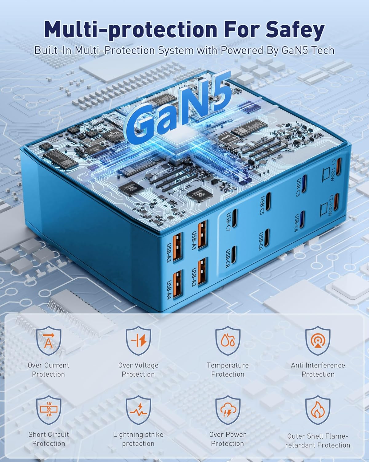 - γ12-in-1 USB C Charging StationγThis 600W USB C Charger Block comes with 8 USB C ports and 4 USB A ports to charge multiple devices, simplify your charging setup, and let you experience the convenience of ultra-fast and ultra-high output charging. With its smart charging technology, it can automatically detect and provide the best power output for each connected device, ensuring fast and efficient charging.