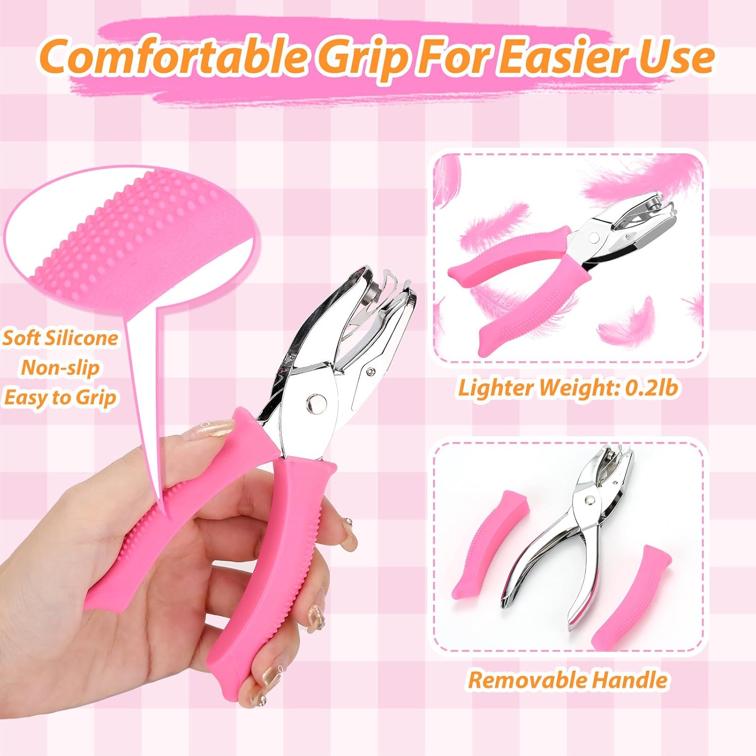 - πΉ γErgonomic Soft-Grip Handles for Zero Strainγ The silicone-coated handles with textured grip mold to your palm, making hole-punching feel like squeezing a stress ball. Punch through 14 sheets of paper effortlessly β no sore hands even after crafting all day!