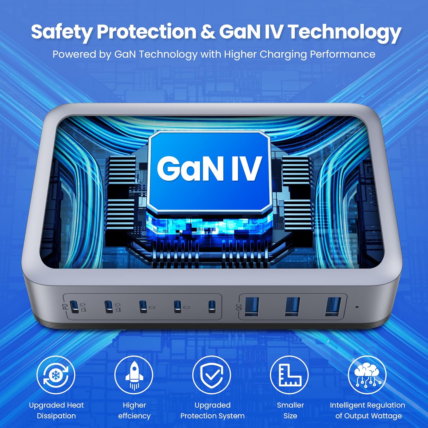 - γ8-in-1 USB C Charging Stationγ: The USB C Wall Charger features 5 USB C ports and 3 USB A ports for powering phones, tablets, headphones, smartwatches, game consoles and more. No need to wait, you can quickly charge up to 8 devices at the same time, and each port intelligently distributes power to ensure you get optimal charging efficiency!no need for more adapters,this 8-in-1 charging station will reduce your accessories burden and help you create an organized and clean desktop.Our GaN IV desktop charging station easy to carry,just L 4.7*W 3.3*H 1.1 inch and weighs 0.6kg,With the free 5FT/1.5m long Detachable power charging cordοΌApplicable to desktop, bedside, counter, nightstand, office.
