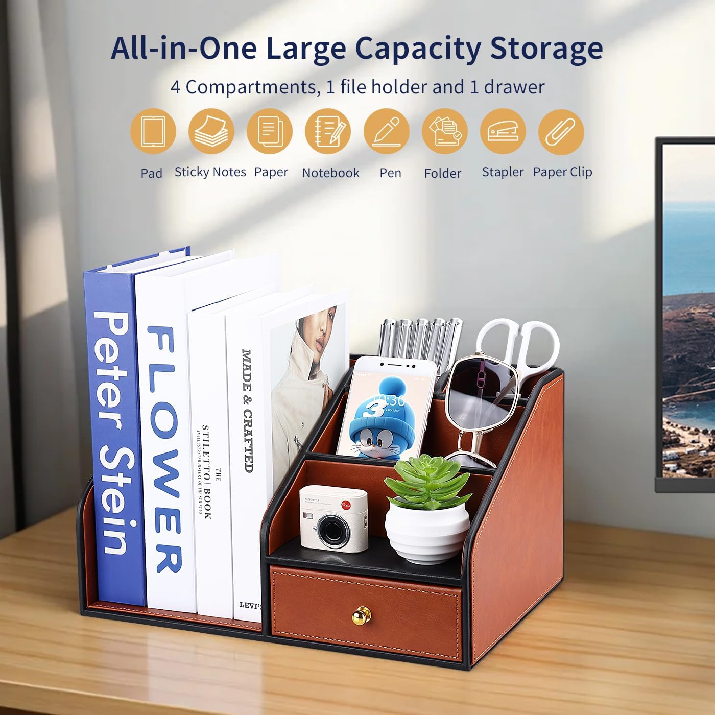 GORESE PU Leather Desk Organizer with Magazine File Holder, Drawer and 4 Compartments, Office Workspace Organizers and Accessories, Large Desktop Organization with File Rack Pen Holder - Tan Brown