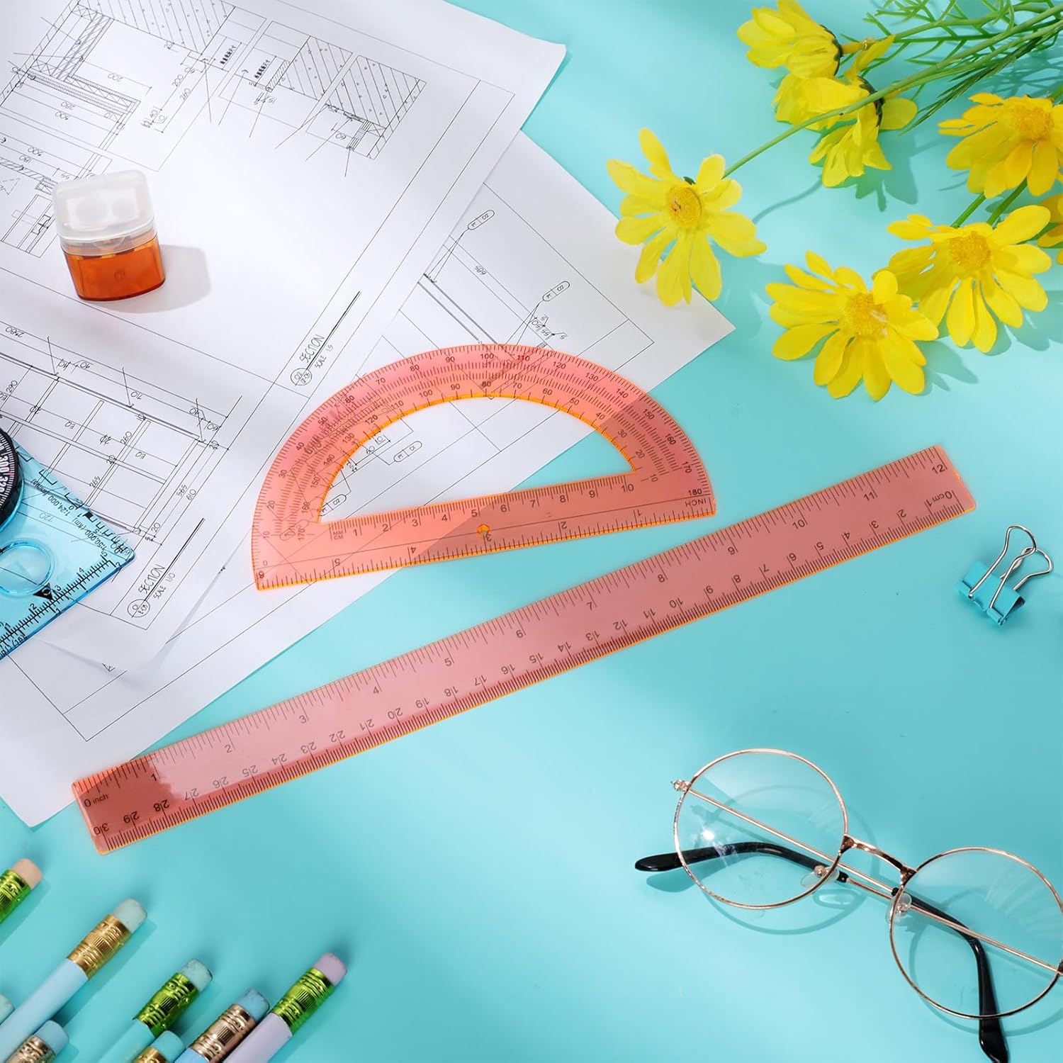 Zonon 2 Pack 12'' Plastic Ruler and 6'' Plastic Protractor Set Clear Ruler Protractor Set Math Geometry Supplies for School Classroom Home Office Drawing(Orange)