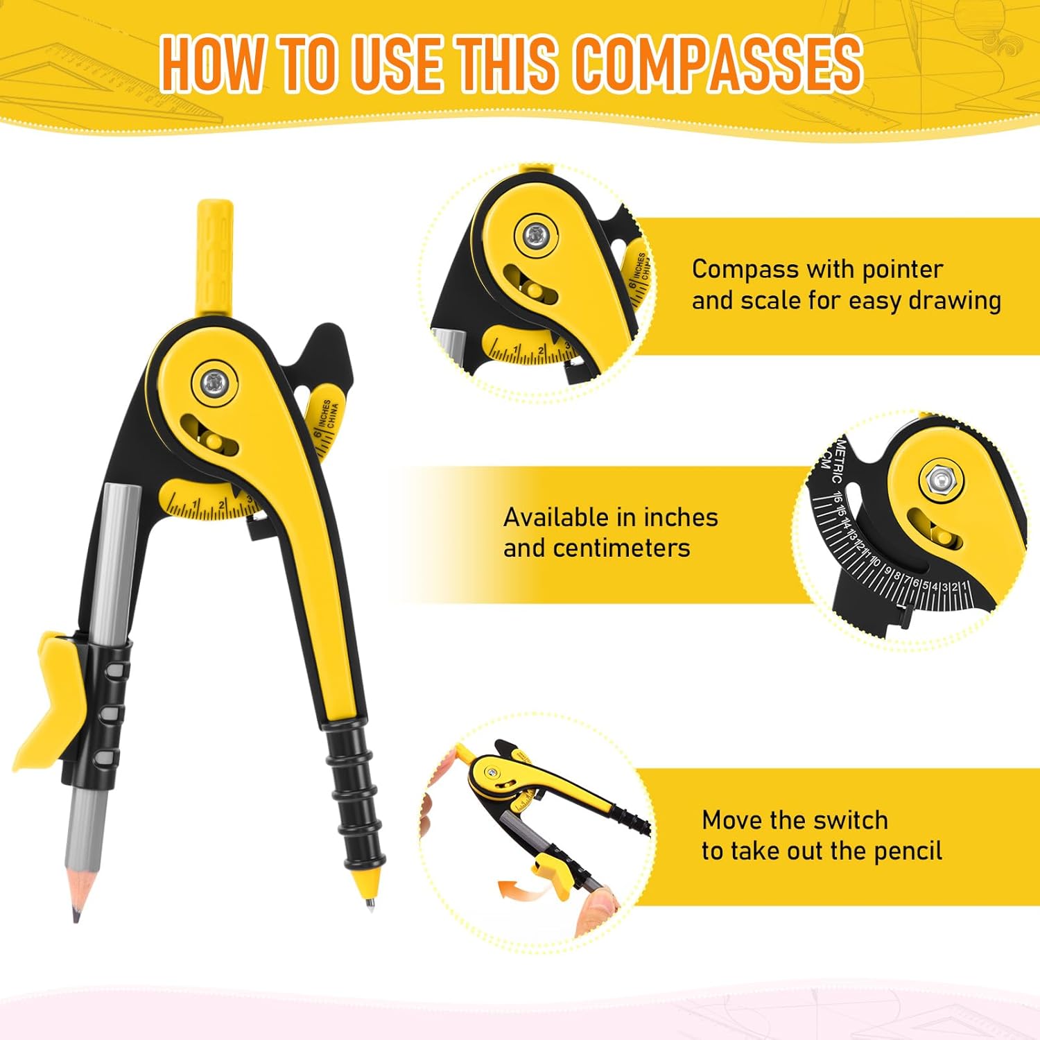 - 2 Diverse tips design compass: compass is made of plastic, sturdy mechanism can hold a radius well; The opposite side of the pencil end is an adjustable separated jaw, which allows you to fix the pencil