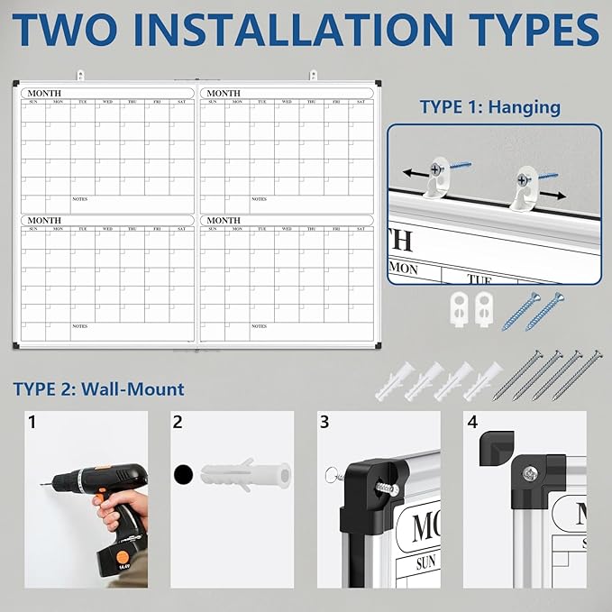 - 【Flexible installations】1.Wall-Mount: Utilize a drill equipped with a 1/4-inch bit to create holes at the desired wall locations. Secure the whiteboard in place using screws for enhanced stability. 2.Hook-and-Hang (for easy removal): Locate the 2 hooks and 2 screws in the installation kit. Attach the whiteboard by hanging it securely with the hooks.