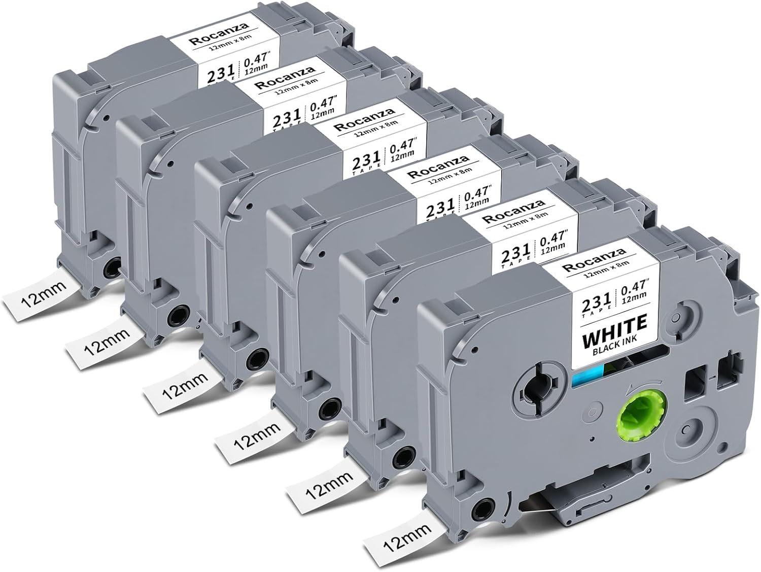 - Rocanza TZE-231 12mm 0.47" Laminated White Label Tape β 6 Pack Compatible for Brother p touch label tape tz-231 tze231. Width: 0.47 Inch (12mm), Length: 26.2 Feet (8m) each tape. Color: Black on White
