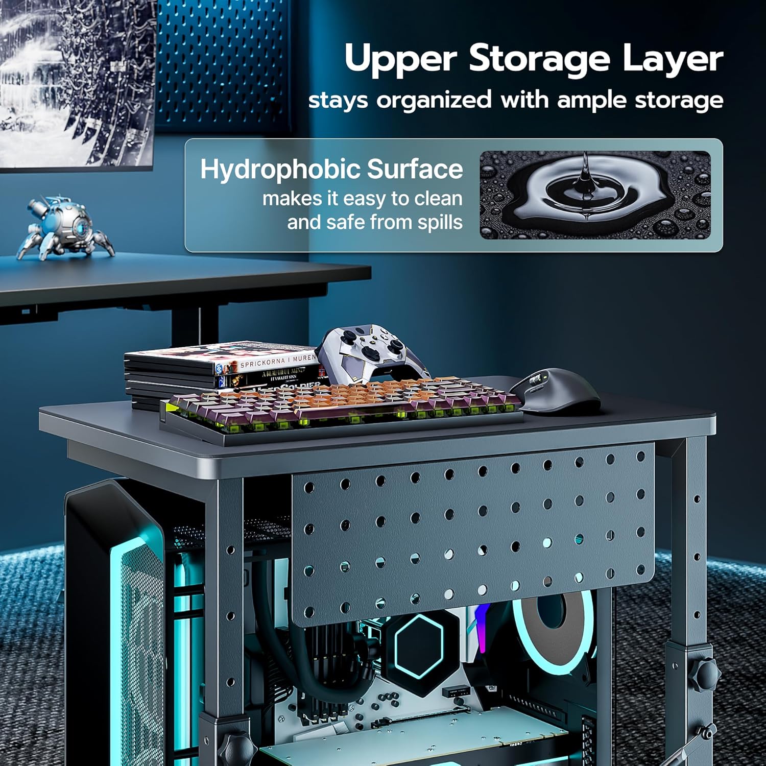 - 【Quick Setup & Multi-Scene Versatility】Setting up and using the computer tower stand is straightforward and hassle-free. Our 2-tier mobile PC stand features easy assembly with clear instructions and an installation video, making setup a breeze—no tech skills needed. Beyond holding your PC, this tower stand can serve as a mobile workstation, side table, or storage solution, making it a versatile addition to any space. Transition seamlessly among your gaming space, workspace, and living area