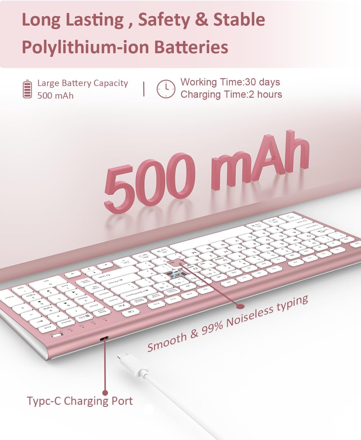 - γEnvironmental Protection and Energy SavingγοΌNever worry about running out of power again! Our high-capacity long-lasting rechargeable battery. The battery capacity is about twice that of most standard wireless keyboards.No more tossing out disposable batteries; itβs eco-friendly and cost-saving. Type C charging port, charging takes about 1.5 hours, with a usage time to about 60 days (depending on usage habits). The smart low-battery reminder ensures youβre always prepared, whether youβre working on a cross-country flight or a long study session.β