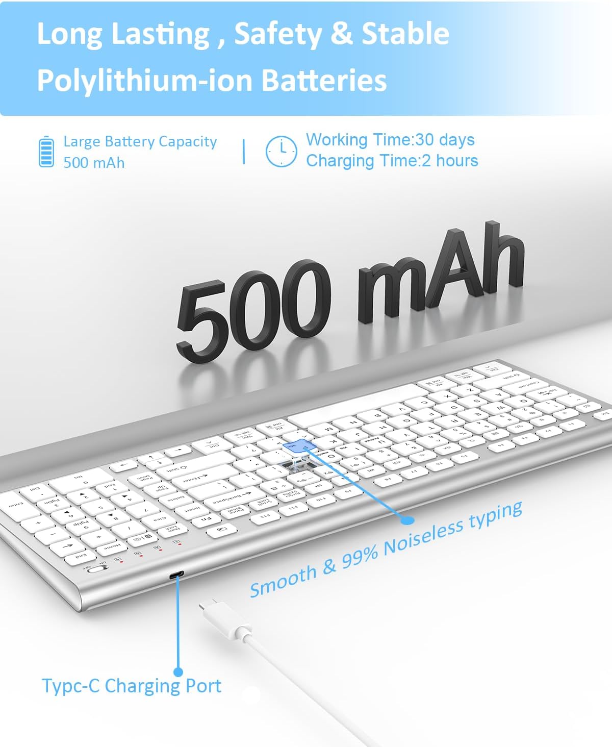 - γEnvironmental Protection and Energy SavingγοΌNever worry about running out of power again! Our high-capacity long-lasting rechargeable battery. The battery capacity is about twice that of most standard wireless keyboards.No more tossing out disposable batteries; itβs eco-friendly and cost-saving. Type C charging port, charging takes about 1.5 hours, with a usage time to about 60 days (depending on usage habits). The smart low-battery reminder ensures youβre always prepared, whether youβre working on a cross-country flight or a long study session.β