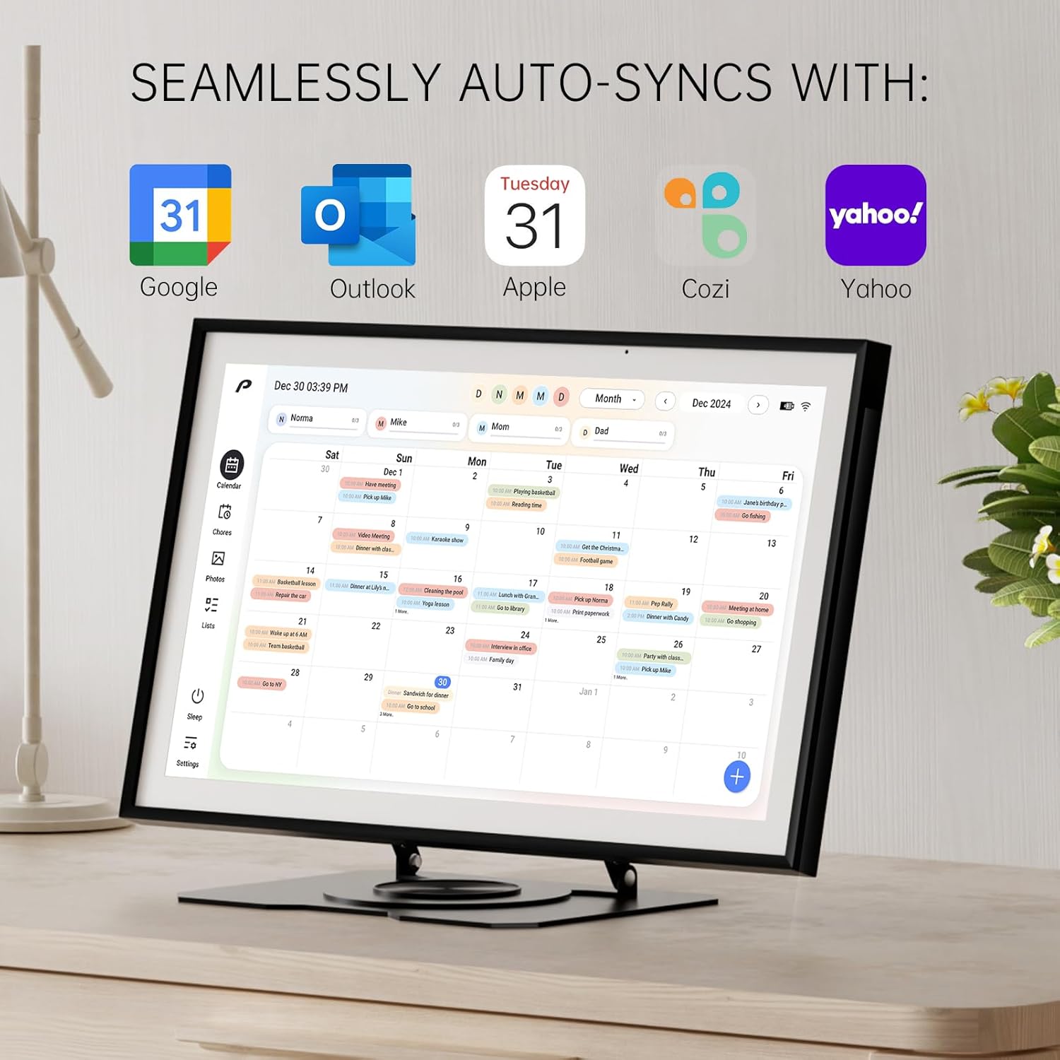 - All-in-One Family Organizer: Sync effortlessly with Google, Outlook, iCloud, Yahoo, and Cozi calendars to streamline dinner plans, chore charts, and lists. Keep your smart home running smoothly with this digital wall calendar
