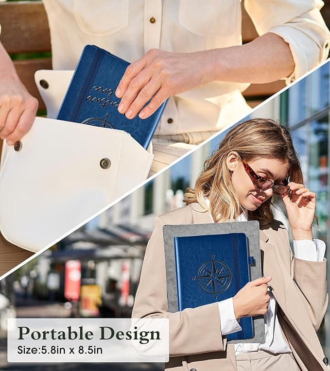 - 【Smart Organizational Features】:Crafted from soft vegan leather, this 5.8" x 8.5" A5 journal includes 1 elastic pen holder (keeps your writing tool handy), 2 elastic closures (secures pages tightly), 3 colored ribbon bookmarks (mark key sections), and 1 inner pocket (stores loose papers or receipts).Lightweight and portable, it fits effortlessly into bags for on-the-go use.