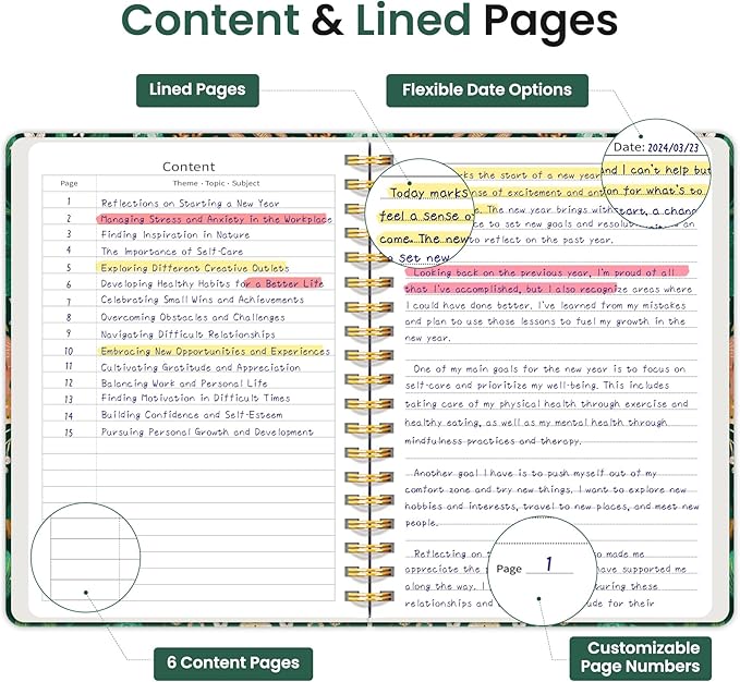 - Structured College-Ruled Pages: Featuring 7mm college-ruled lines, this journal notebook helps keep your writing organized and legible. The evenly spaced lines are perfect for structured notes, work lists, or detailed writing, making it an excellent choice for school students, professionals, and writers alike. It also includes 6 content pages, perfect for creating an index for easy reference.