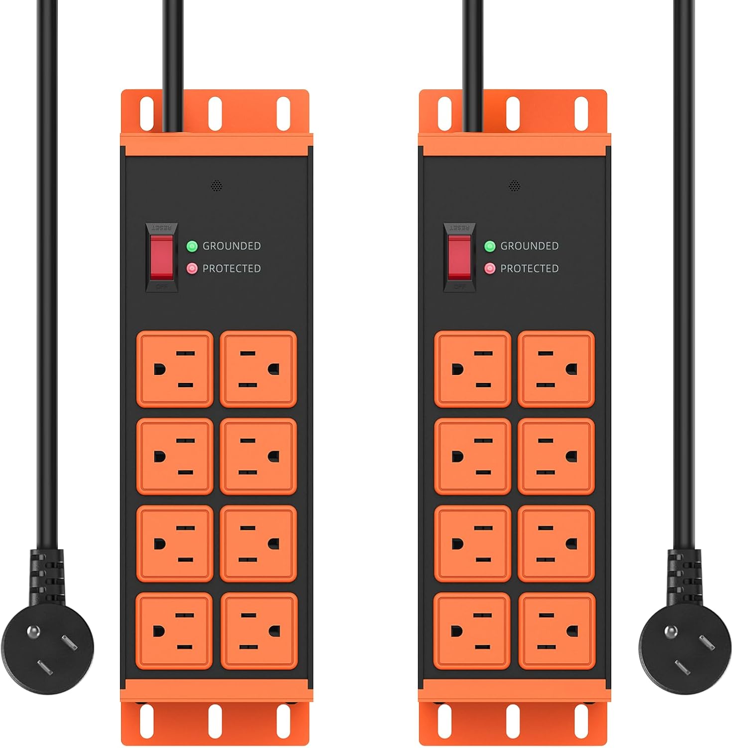 2 Pack Heavy Duty Power Strip 8 Outlets, Work Shop Outlet Strip Surge Protector 4800J, Industrial Metal 15Amp Power Strip, 6FT Extension Cord, ETL Listed