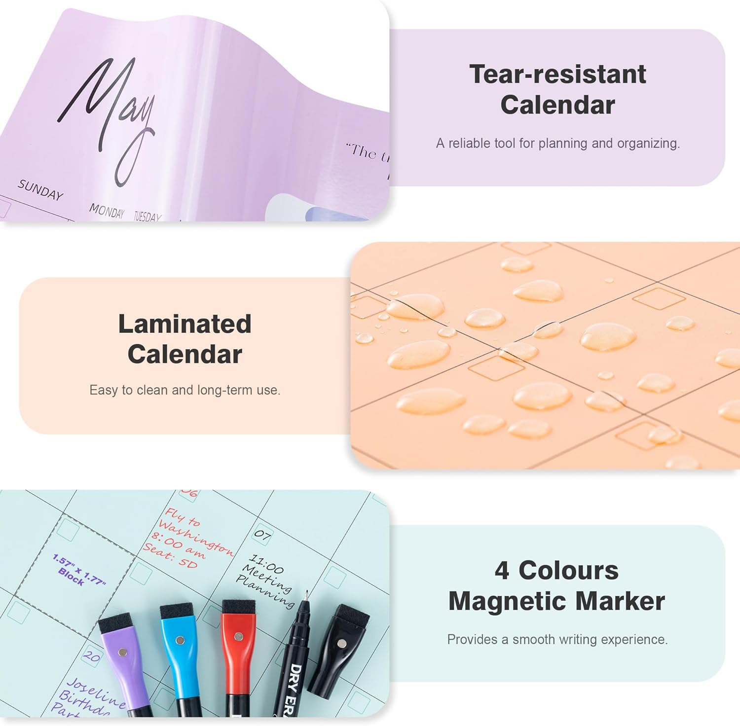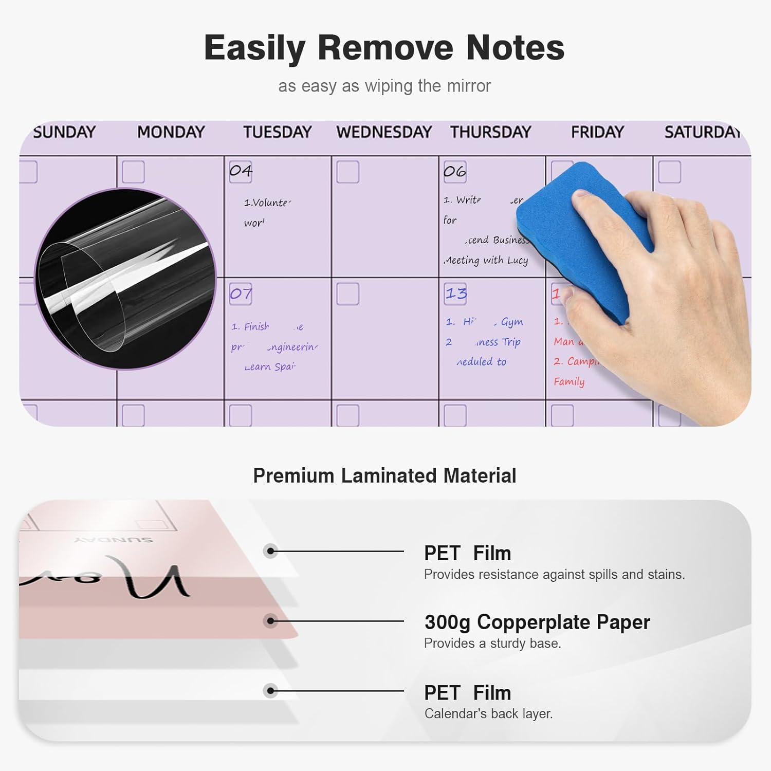 - β¨ Dry Erase Wall Calendar : is made of PET Film and 300 grams Copperplate Paper, providing a durable surface that resists scratches and smudges, while the sturdy Copperplate Paper backing keeps it in place without curling.
