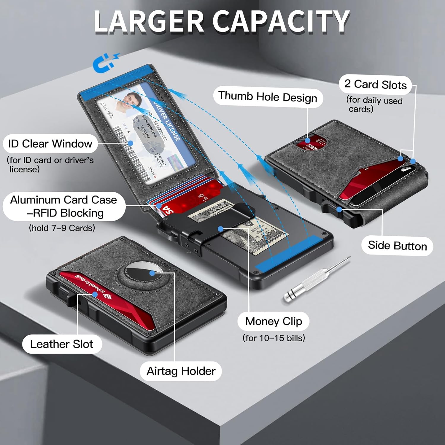 - MINIMALIST BUT LARGE CAPACITY - Our minimalist wallet for men with air tag holder fits effortlessly in pockets without bulk, yet holds 12+ cards, cash, and AirTag securely. A money clip on the inside of the card holder helps you store cash.