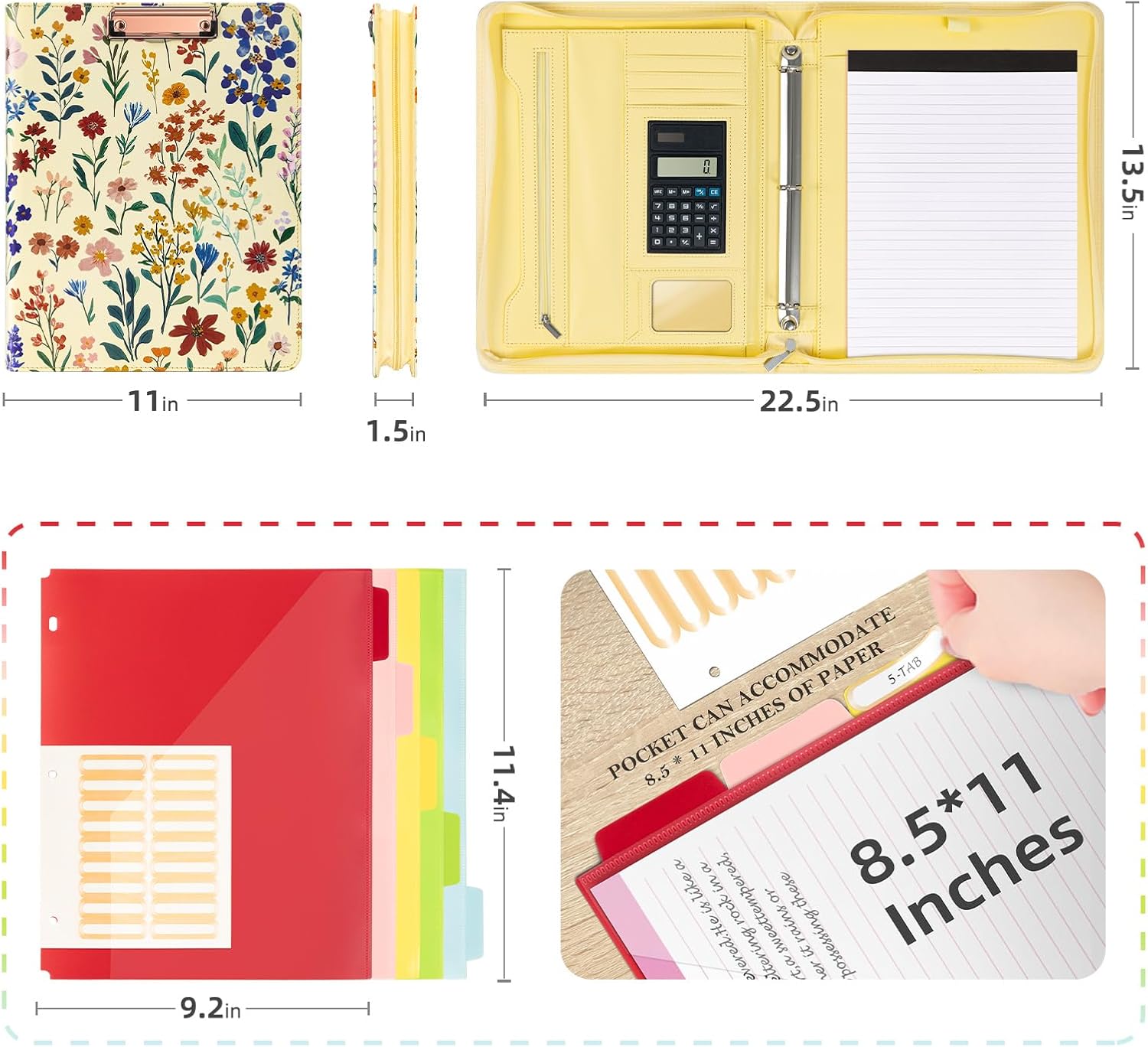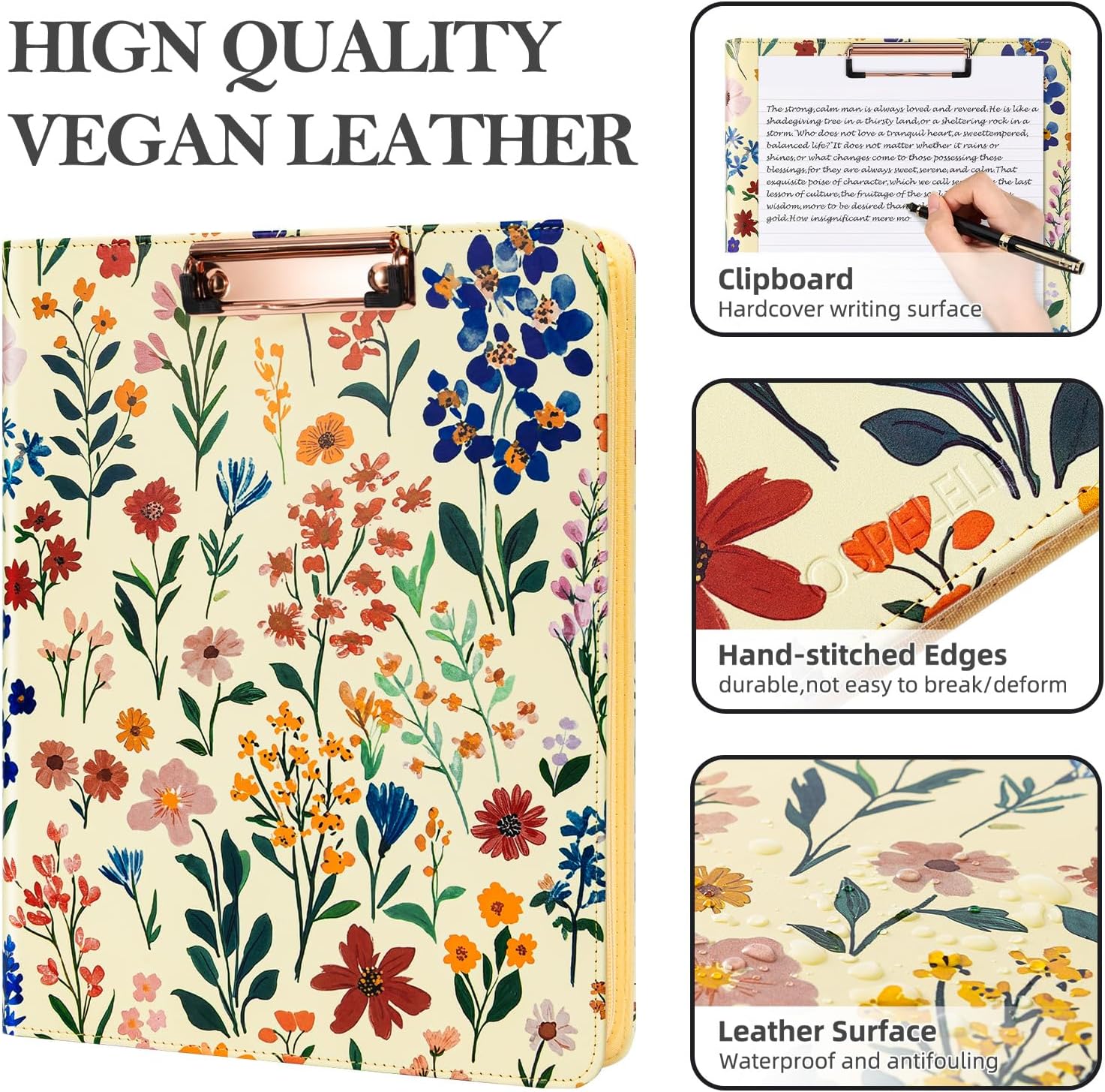 Ospelelf Leather Clipboard Binder with Storage - 3 Ring Zippered Padfolio Portfolio Folder - Calculator, 12.1” Tablet Sleeve, 5 Dividers with Pocket, Refillable Notepad, Card Slot (Floral)