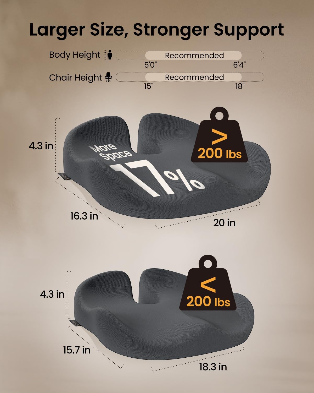 - Extra Large Seat Cushion: Ergonomically designed to relieve sciatica, coccyx, and lower back discomfort, ProtoArc extra-large memory foam cushion(20"L x 16.9"W x 4.3"H) offers exceptional support for all-day comfort and improved posture