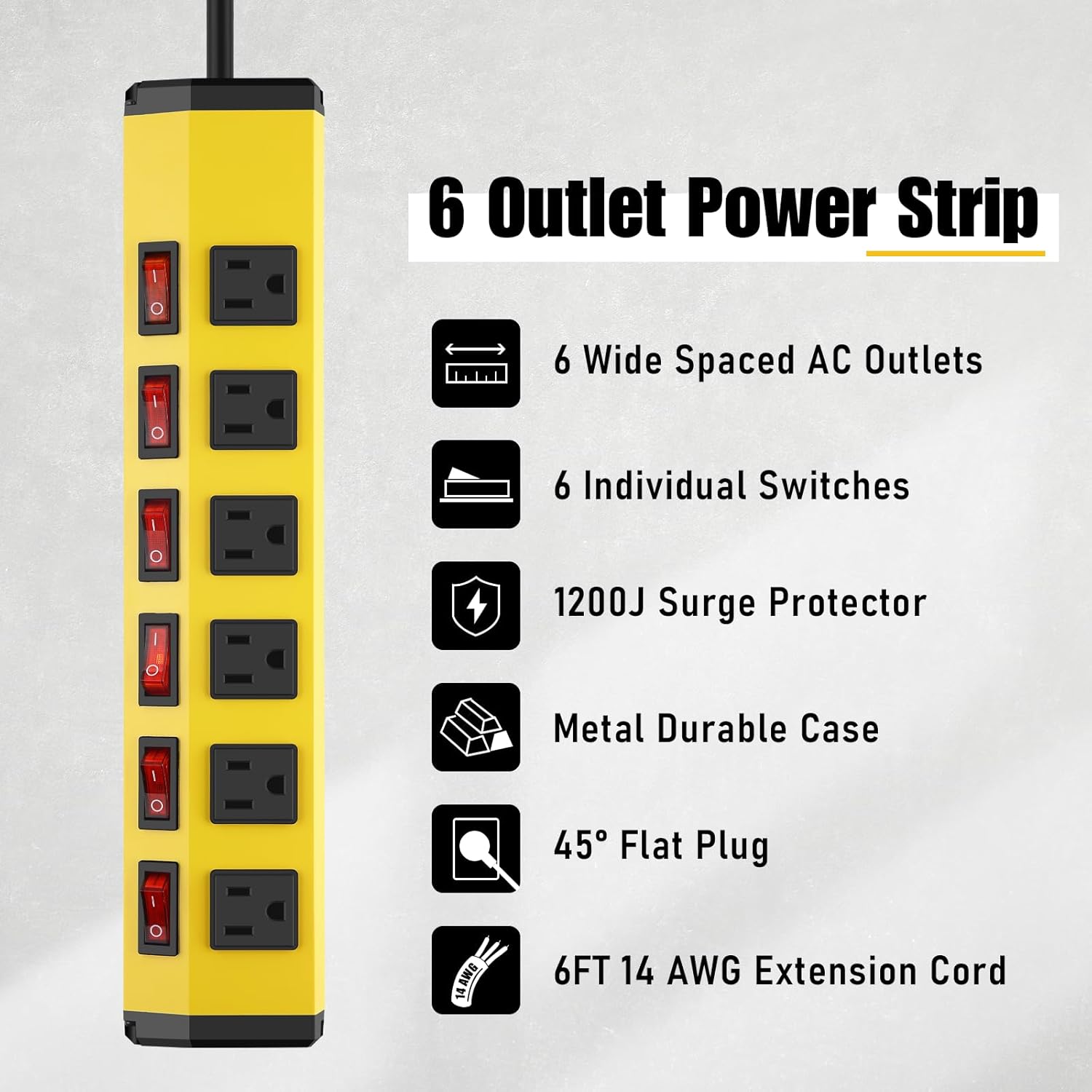 ANNQUAN 4PCS 6 Outlet Metal Power Strip with 6 Individual Switches,Heavy Duty Power Strip 1200J 15A 6FT Cord Home Office Industrial Commercial Shop