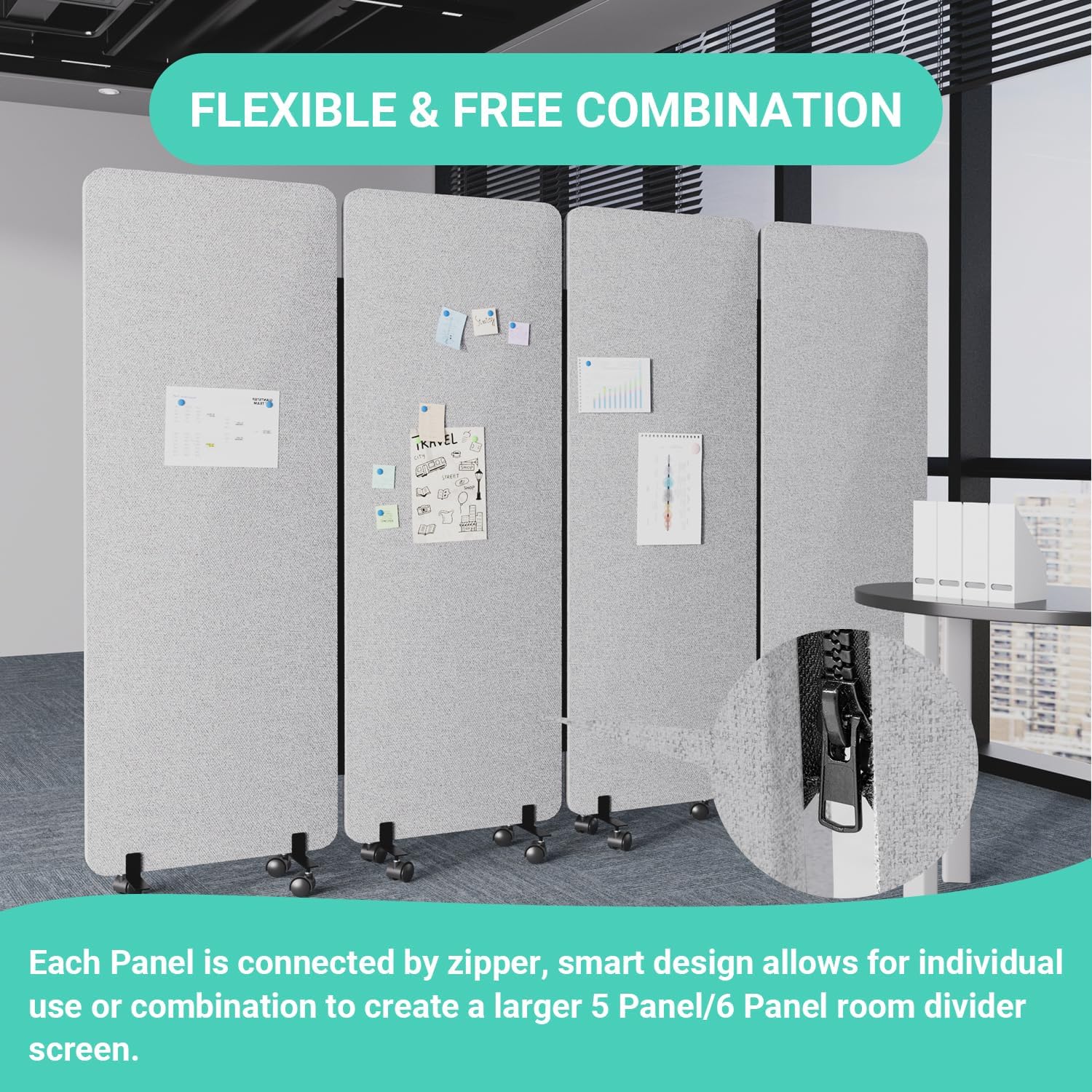 - SMART & FREE COMBINATION: Each Privacy Panel Screen is connected by zipper, smart design allows for individual use or combination to create a larger 4 Panel room divider screen according to your project demands. The flexible design allows for wrapping the room partition around office desks and tables to create private workplace. Each Panel Size: 24βL x 66βH