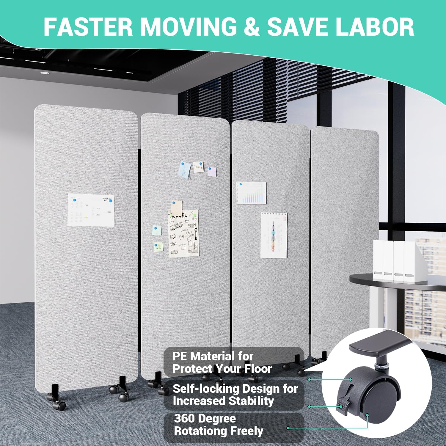 - MOVING EASILER & SMOOTHLY: Our sound proof dividers is equipped with self-lockable universal wheels, which help you move around more easily. The brakes on the room divider wheels will improve the stability and prevent slipping. The reinforced metal base is rust-proof and maximises the life of the partition room dividers.