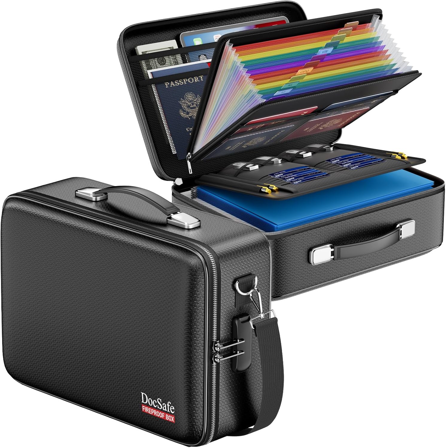 - Fireproof Box with Lock: Protect your valuables with the built-in high-quality combination lock (No keys required). Design with a strong handleοΌa detachable shoulder strap for carrying everything you needed easily. The fireproof box is suitable for business, travel, office, school, home storage, of course, giving it as a gift to your family is also a good choice. Fireproof box is both fireproof and water-resistant, ensuring your documents stay protected during fires, floods, or wet weather