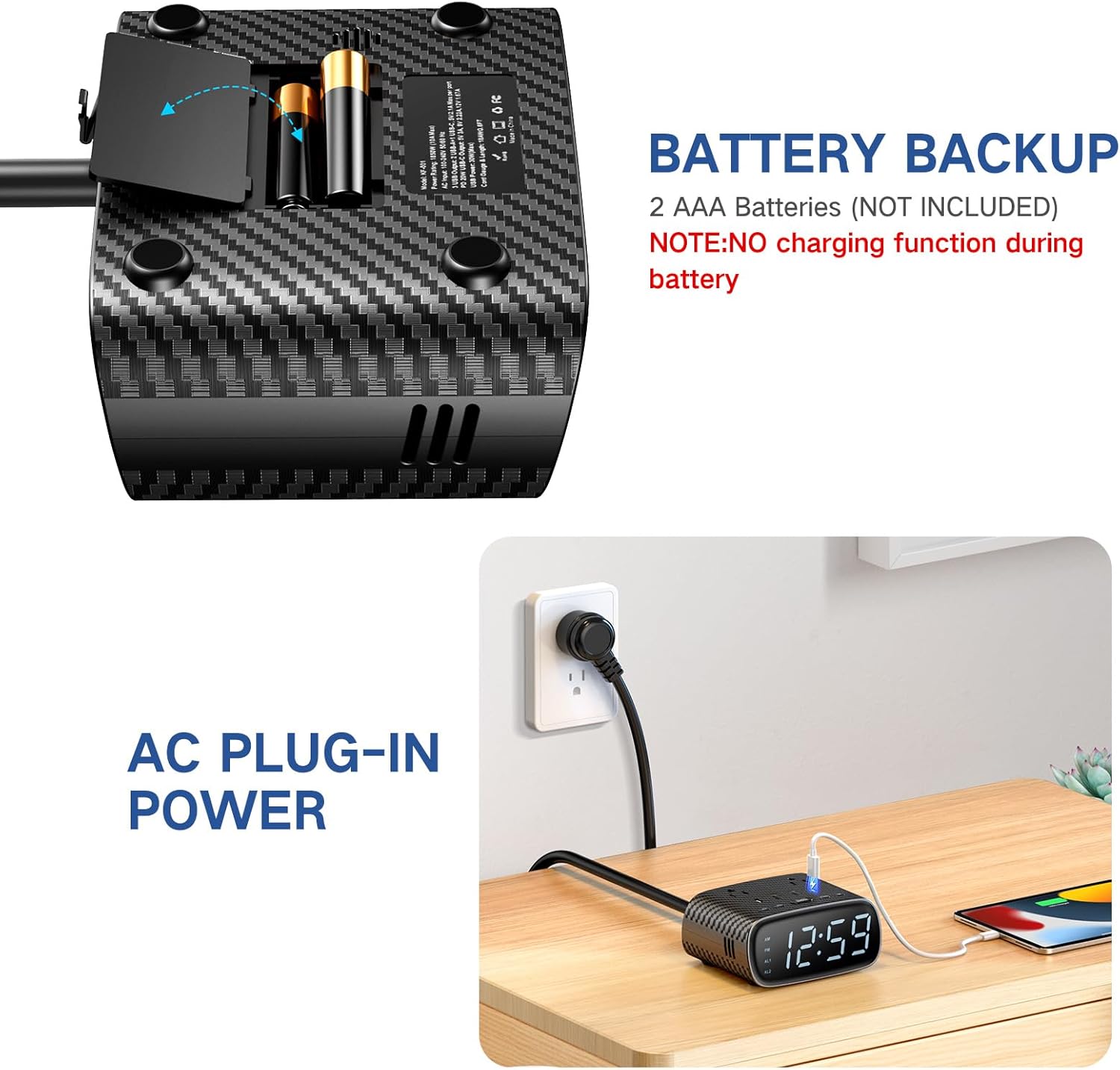 - 【𝟒-𝐈𝐍-𝟏 𝐀𝐥𝐚𝐫𝐦 𝐂𝐥𝐨𝐜𝐤 𝐰𝐢𝐭𝐡 𝐔𝐒𝐁 𝐏𝐨𝐫𝐭𝐬】This alarm clock with USB Ports and outlets is equppied with both 4 USB ports and 2 AC outlets. This black alarm clock USB ports contents 20W USB-C, standard USB-C and 2 USB-A ports. No more than another power strip, it is able to achieve the faster charging and alarm clock function at meantime.
