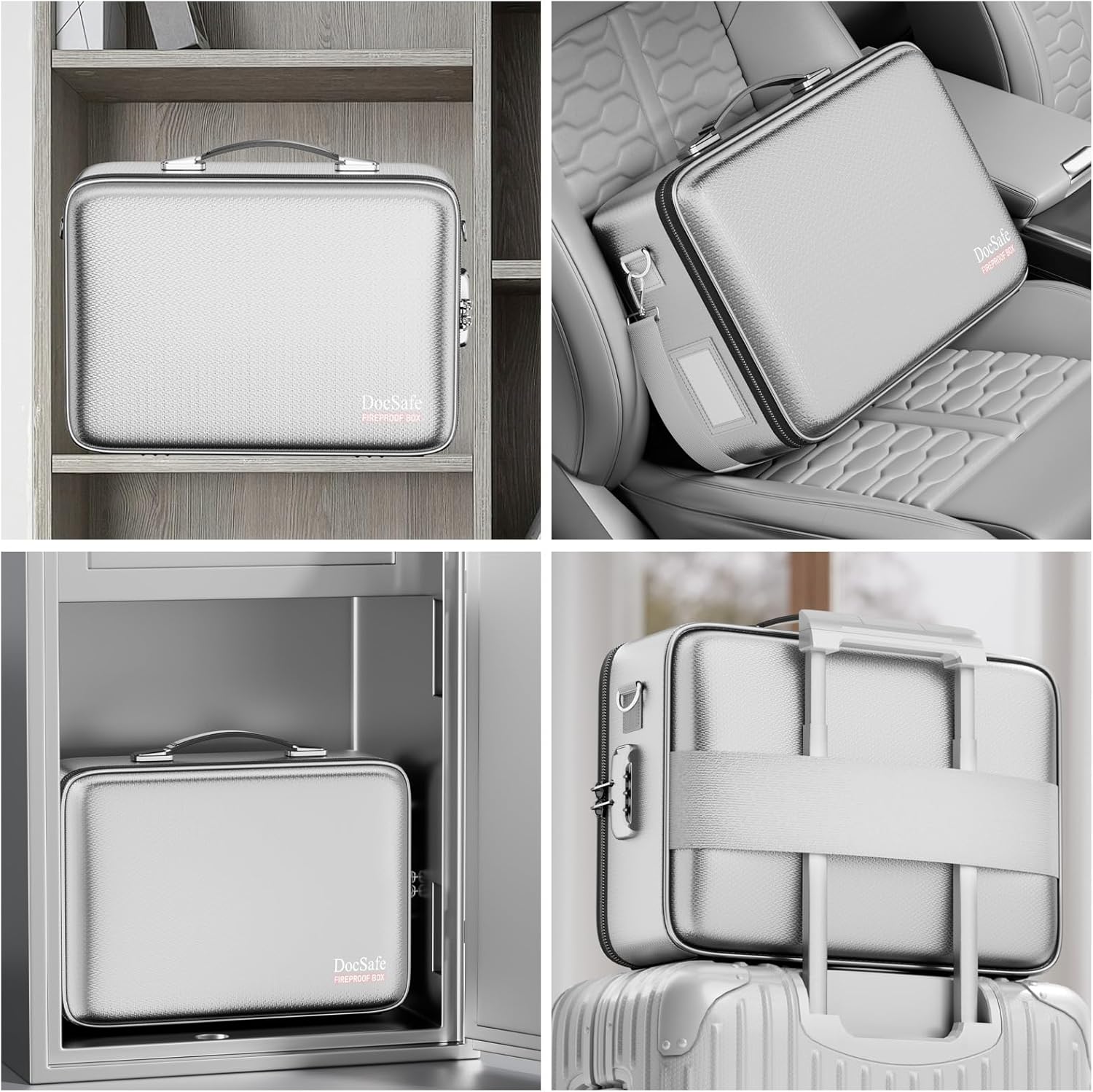 - Fireproof Box with Lock: Protect your valuables with the built-in high-quality combination lock (No keys required). Design with a strong handleοΌa detachable shoulder strap for carrying everything you needed easily. The fireproof box is suitable for business, travel, office, school, home storage, of course, giving it as a gift to your family is also a good choice. Fireproof box is both fireproof and water-resistant, ensuring your documents stay protected during fires, floods, or wet weather