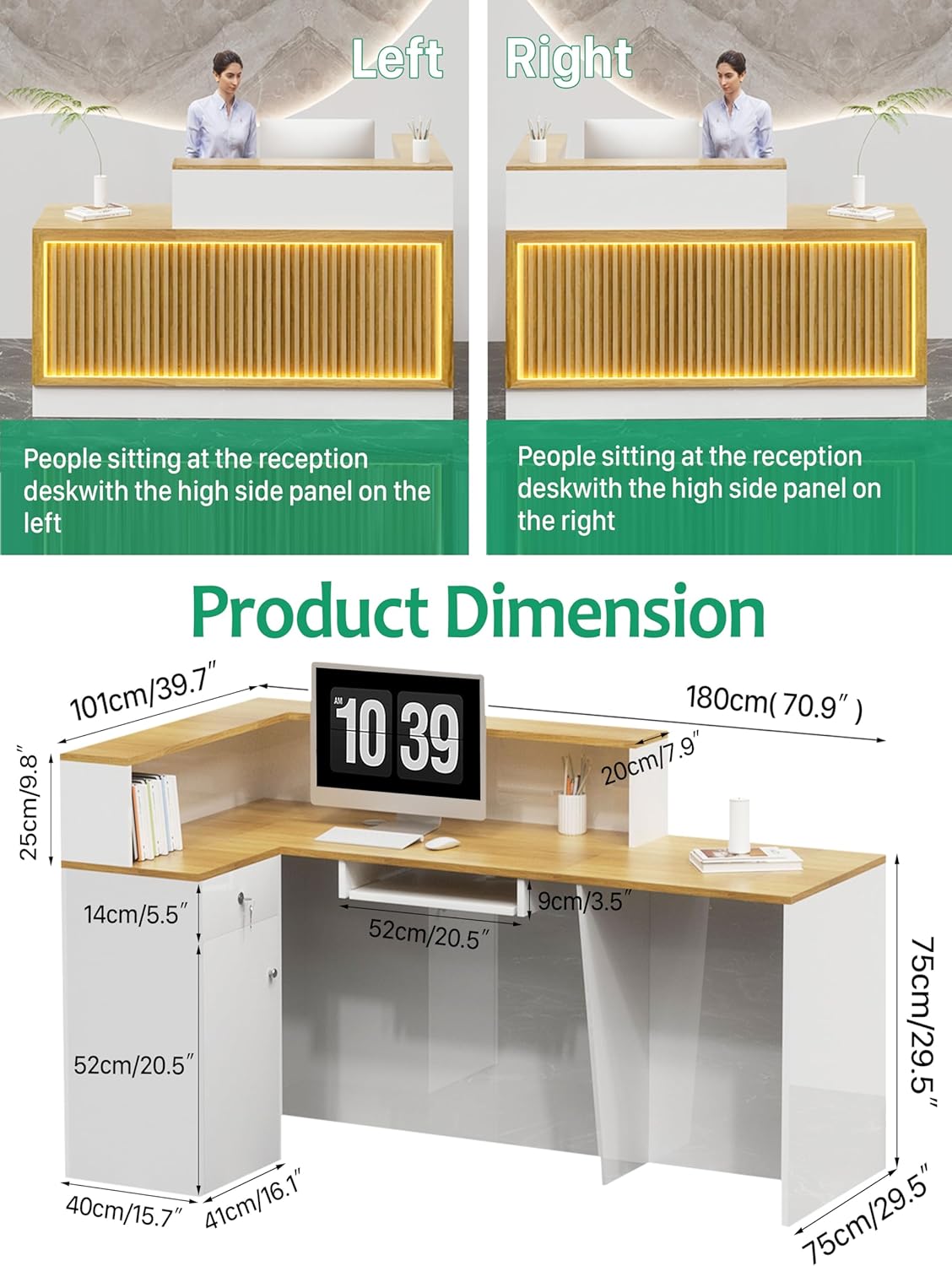 - Spacious & Versatile Design: Choose from 63-inch or 70.9-inch sizes for this L-shaped reception desk, featuring a deep 39.7-inch counter with wrap-around panels, dual-tier shelves, a lockable drawer, and storage cabinet for optimal organization. Perfect as a small reception desk or front desk reception counter, it adapts to offices, salons, or retail stores, maximizing workspace efficiency in any setting