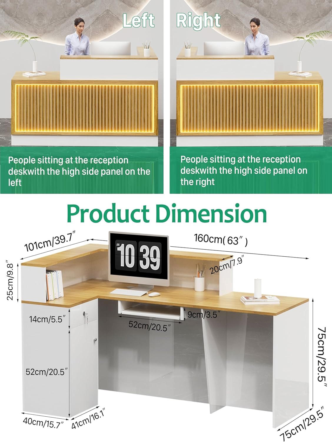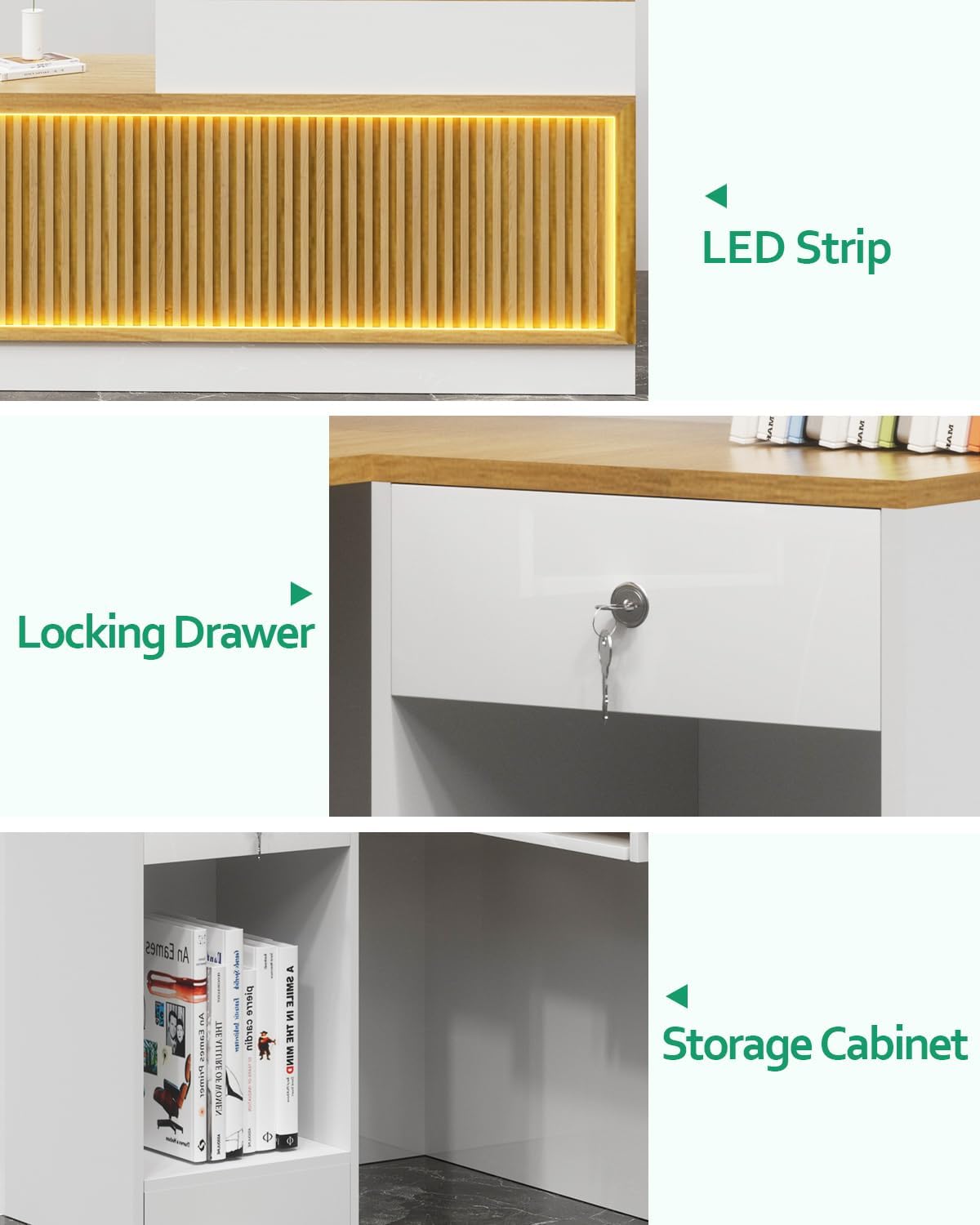 - Modern & Elegant Aesthetics: Elevate your space with a sleek wood-grain grille front and integrated LED light strip, creating a polished modern reception desk look. The smooth lines and two-tone wood-and-white finish offer timeless appeal, making it a stylish white reception desk or reception counter that impresses clients instantly