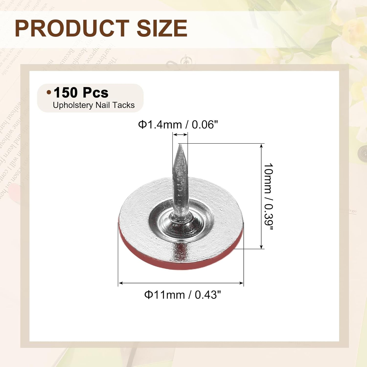 - [Size & Quantity] - The package comes with 150pcs decorative upholstery tacks. Sufficient quantity to meet your different daily needs. The overall size of upholstery nails is about 11mm x 10mm/0.43-inch x 0.39-inch(D*H)