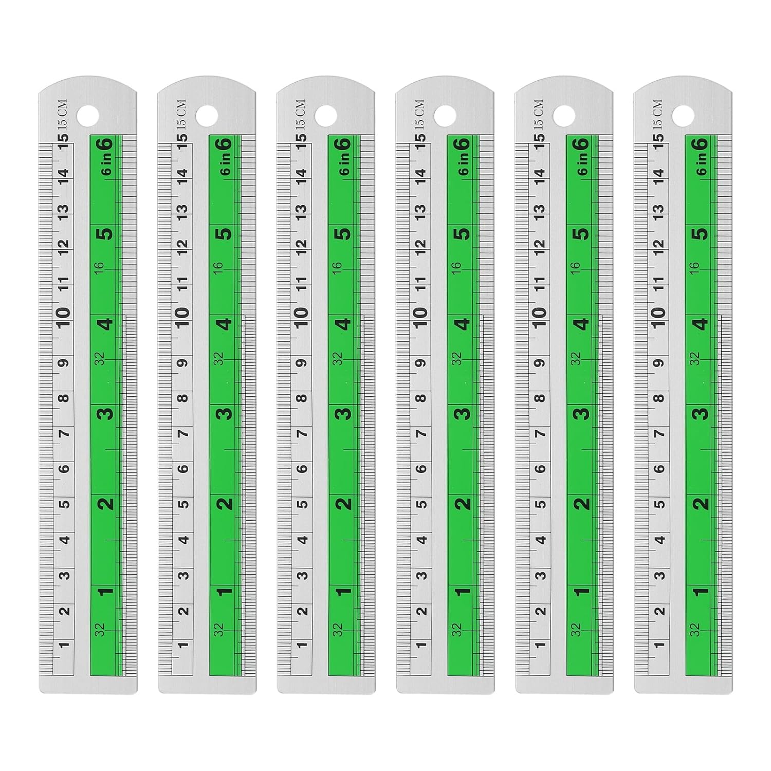 HARFINGTON 6pcs Metal Straight Ruler 15cm Metric SAE Aluminum Alloy Measuring Rulers Scale Tool with Hole for Measure Study Reading Classroom Office, Green