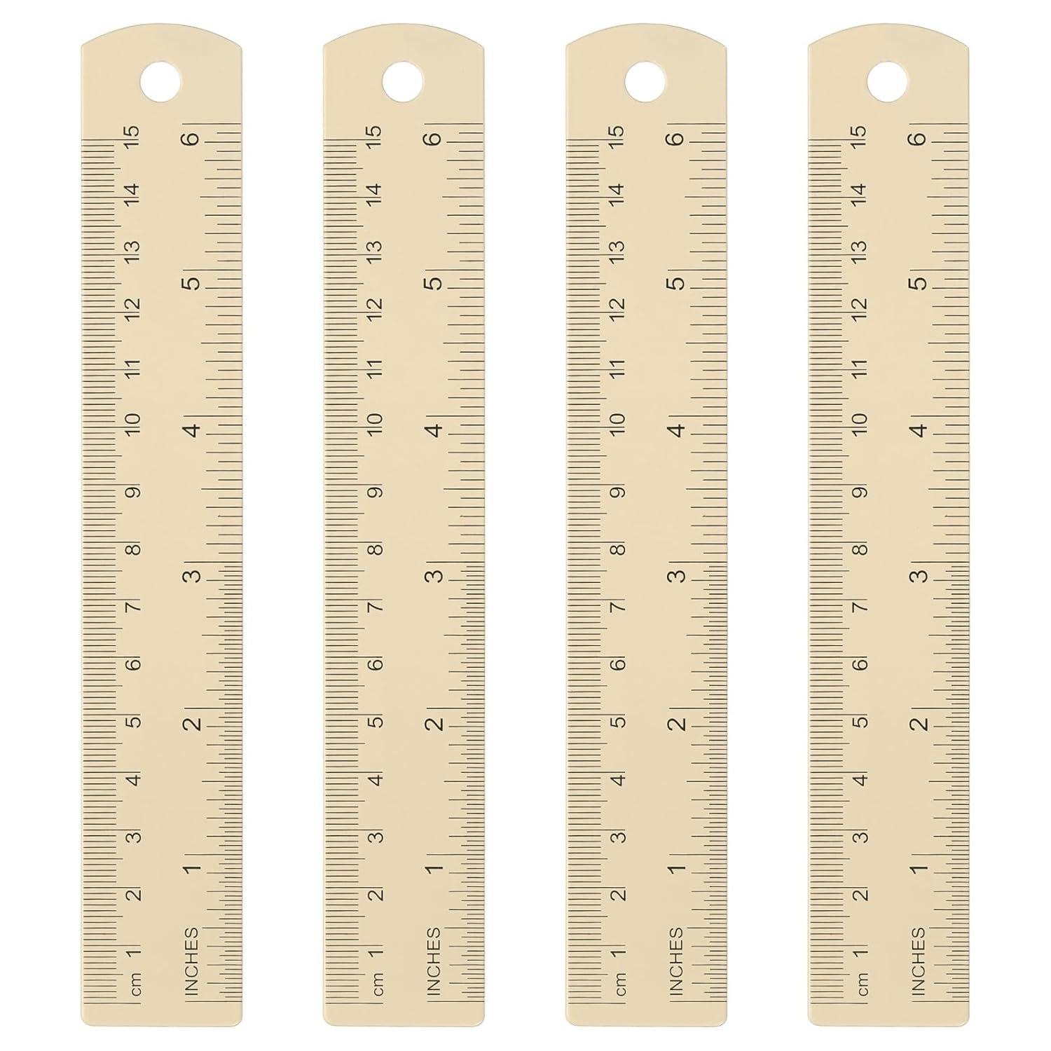 HARFINGTON 4pcs Metal Straight Ruler 15cm Metric SAE Aluminum Alloy Measuring Rulers Scale Tool with Hole for Measure Study Reading Classroom Office, Beige