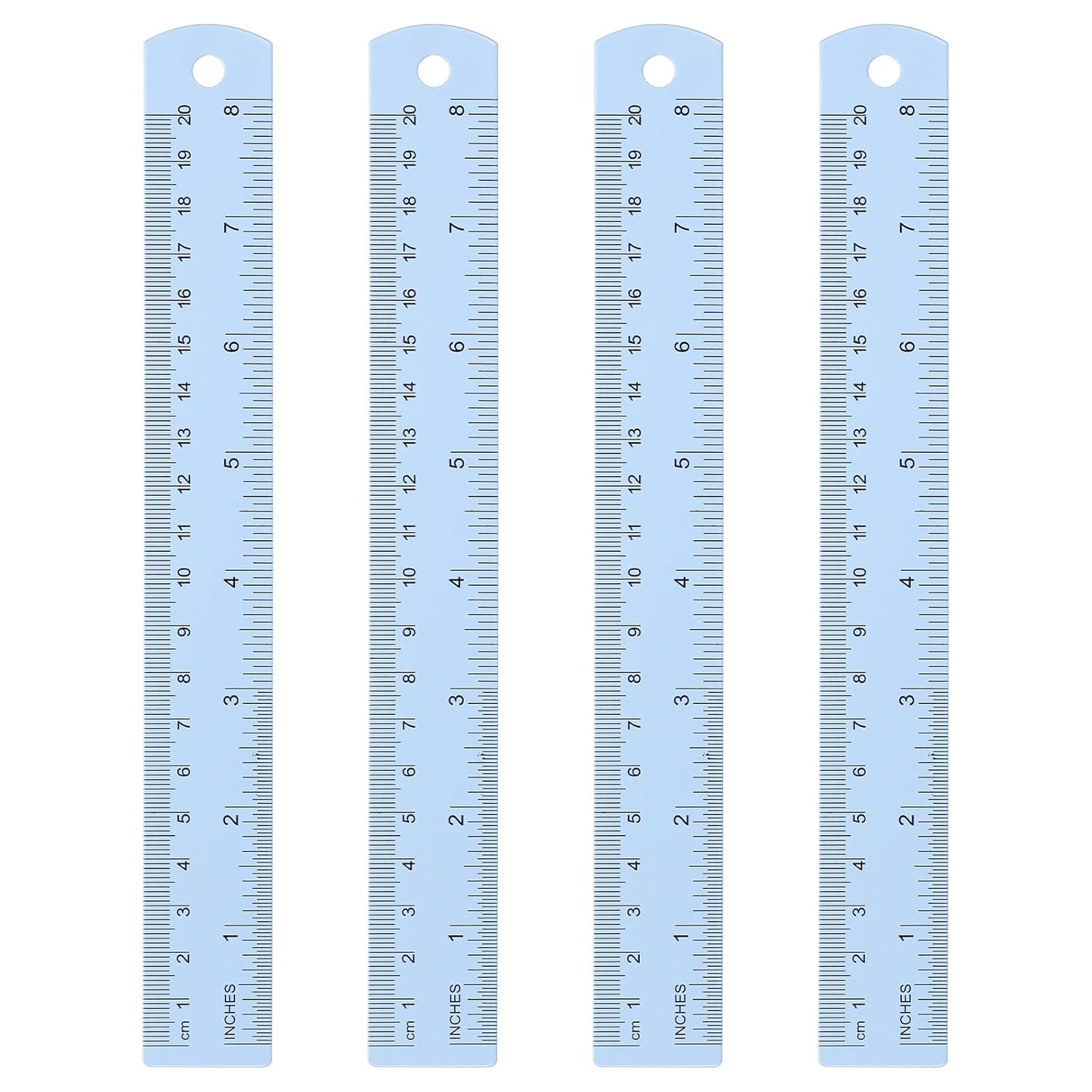 HARFINGTON 4pcs Metal Straight Ruler 20cm Metric SAE Aluminum Alloy Measuring Rulers Scale Tool with Hole for Measure Study Reading Classroom Office, Light Blue