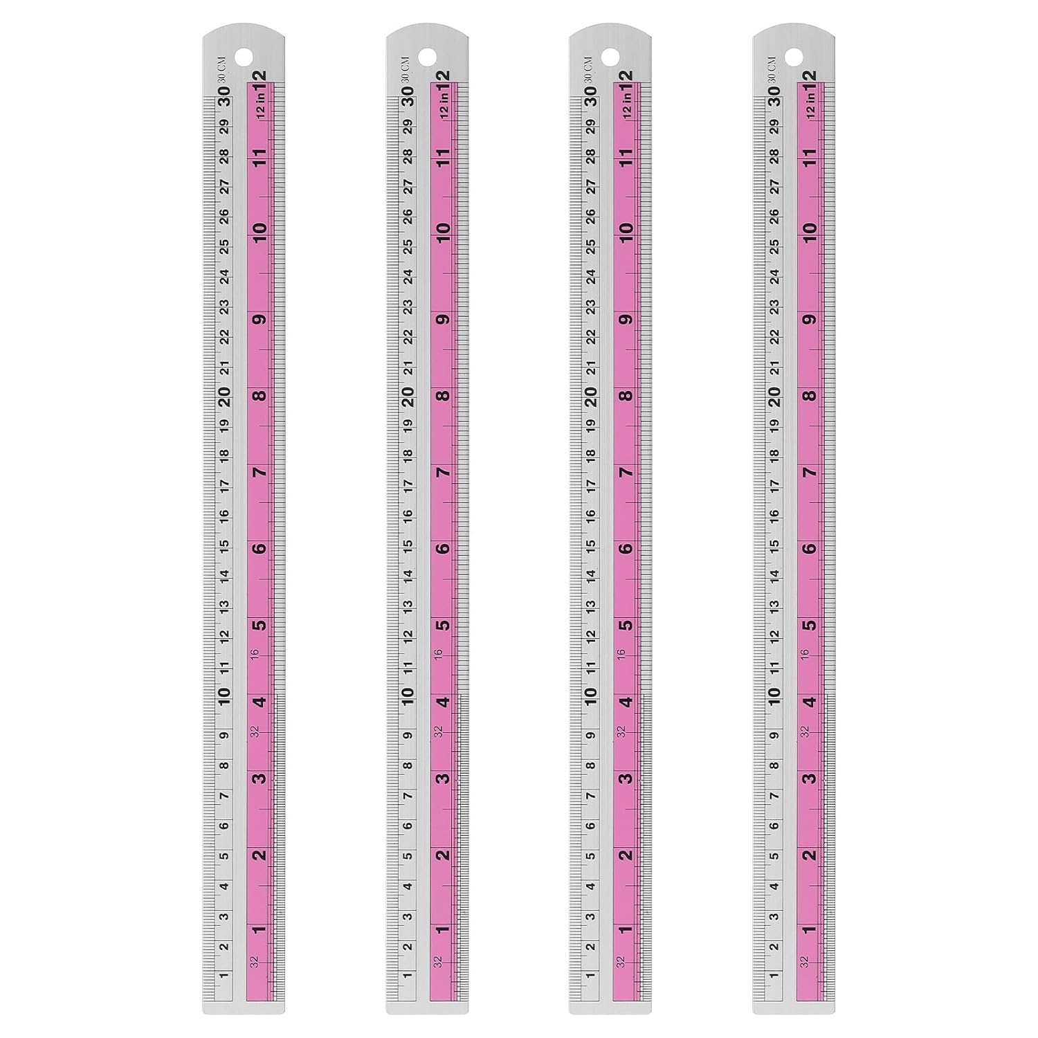 HARFINGTON 4pcs Metal Straight Ruler 30cm Metric SAE Aluminum Alloy Measuring Rulers Scale Tools with Hole for Measure Study Reading Classroom Office, Pink