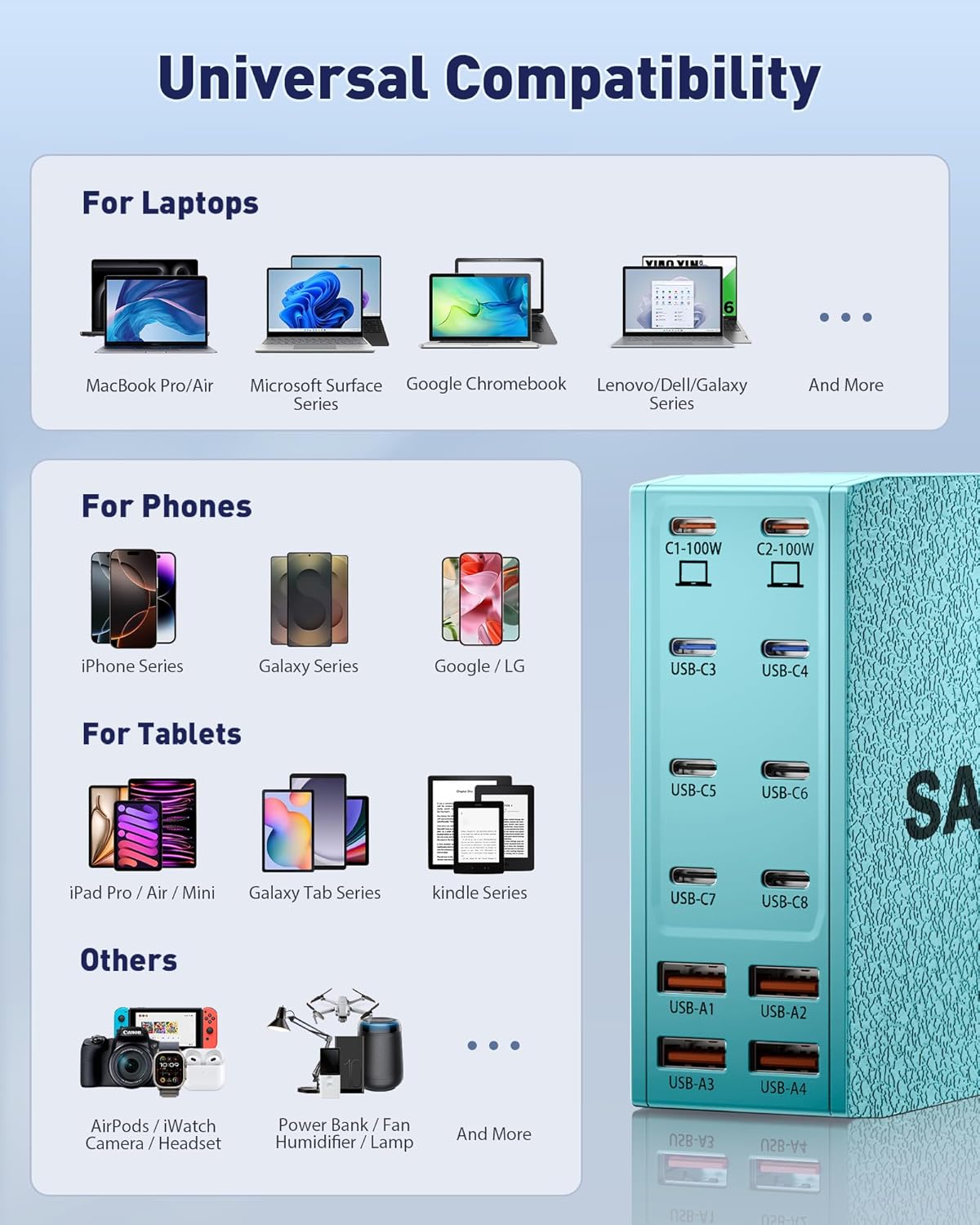 - γUniversal CompatibilityγOur USB C charging station is equipped with 2*100W and 2*65W fast charging ports, which can charge 3 or more laptops at the same time. Compatible with smartphones, tablets and laptops, suitable for MacBook Pro/Air, Dell XPS, iPad Pro, iPhone 16/16 Pro Max, iPhone 15 Pro Max, iPhone 14/13 Pro/12 Pro Max, iWatch, AirPods, Surface Pro, Galaxy S24 Ultra, Switch, Steam Deck, Google Pixel and many other devices.