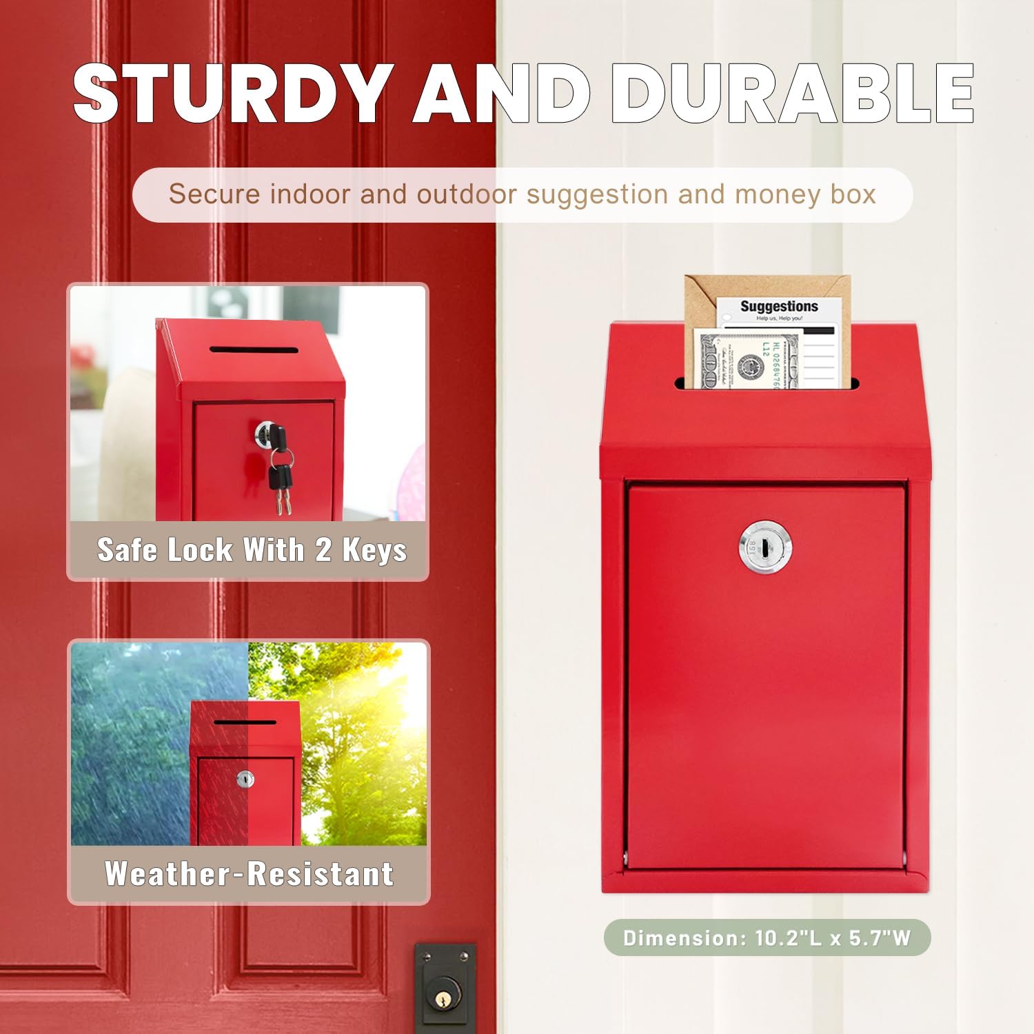 Metal Donation Money Cash Drop Box with Lock and Slot Suggestion Box Wall Mounted Ballot Container Mailbox Delivery for Home Office (Red, 10.24″ x 5.71″ x 2.95″)