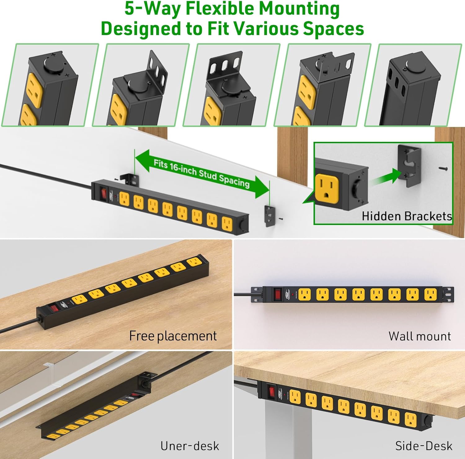 - [Multi-Angle Mounting Freedom] Engineered with unique adjustable & detachable brackets for 3-surface versatility. Securely install vertically on walls, horizontally under desks, or sideways with outlets exposed. Tuck away mounting ears for seamless low-profile applications. Effortlessly adapts to 16" stud layouts and 19" rack systems by reconfiguring bracket orientation.